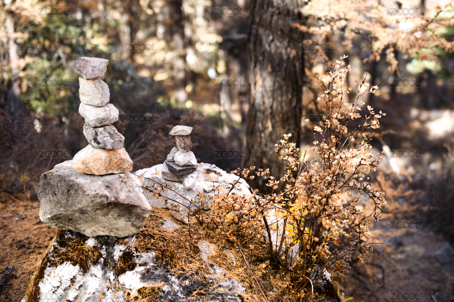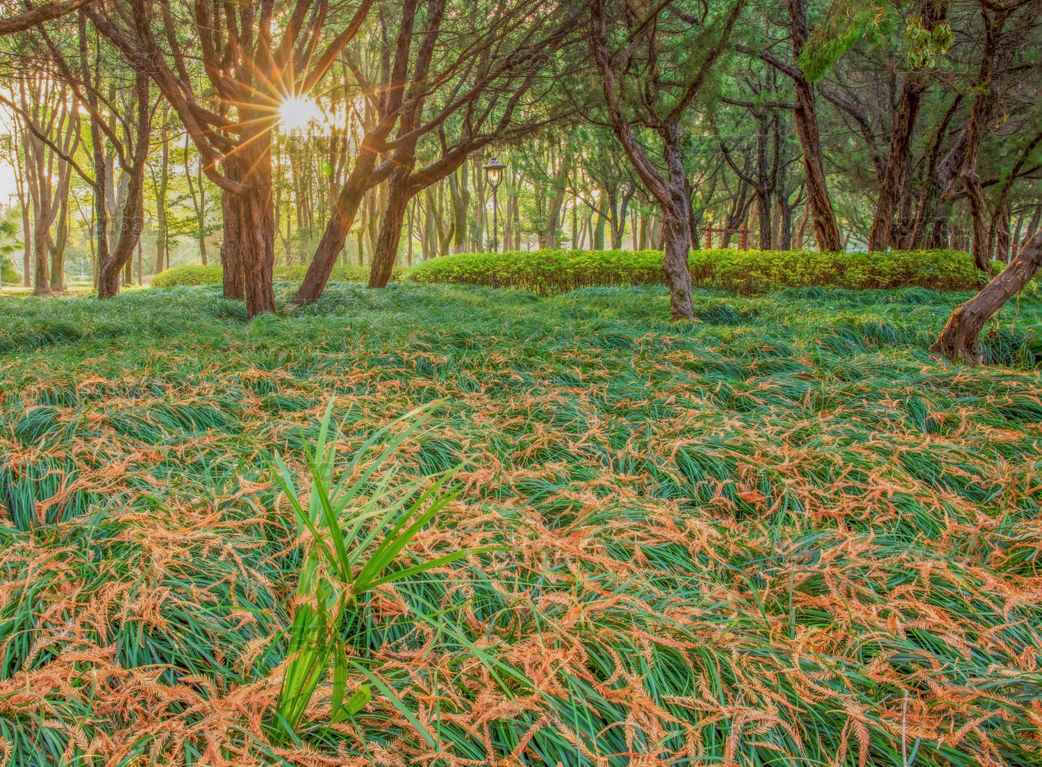 晨光穿過(guò)松柏林照在落葉莎草上
