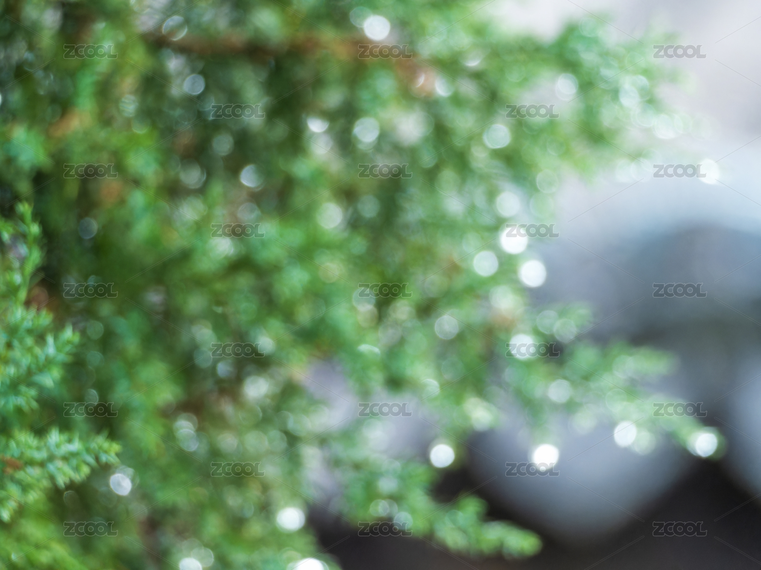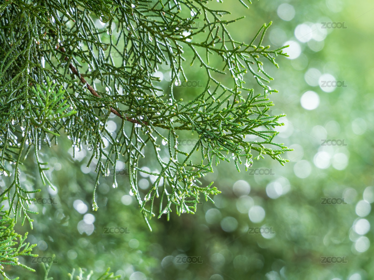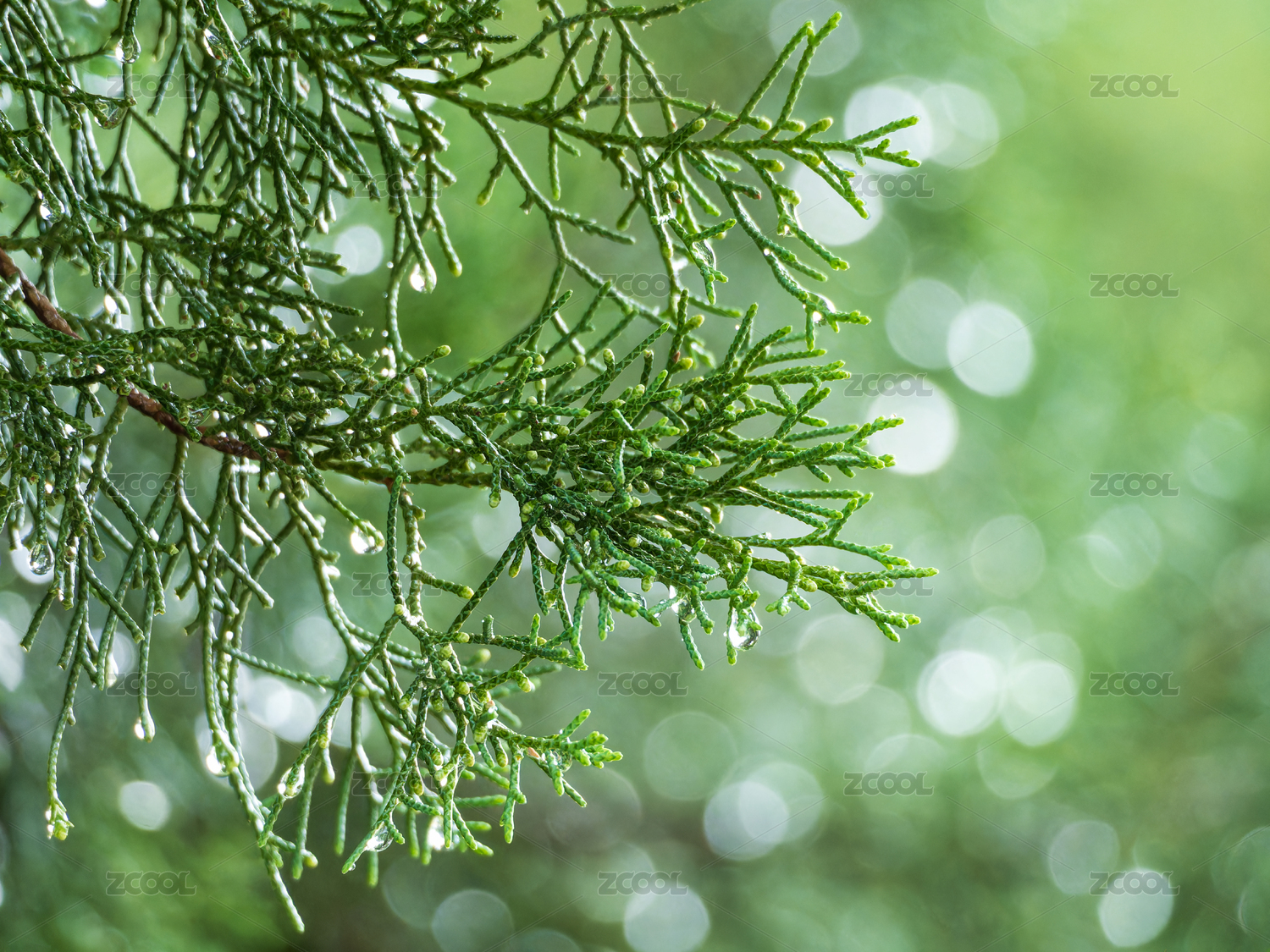帶水珠的翠綠松柏枝葉