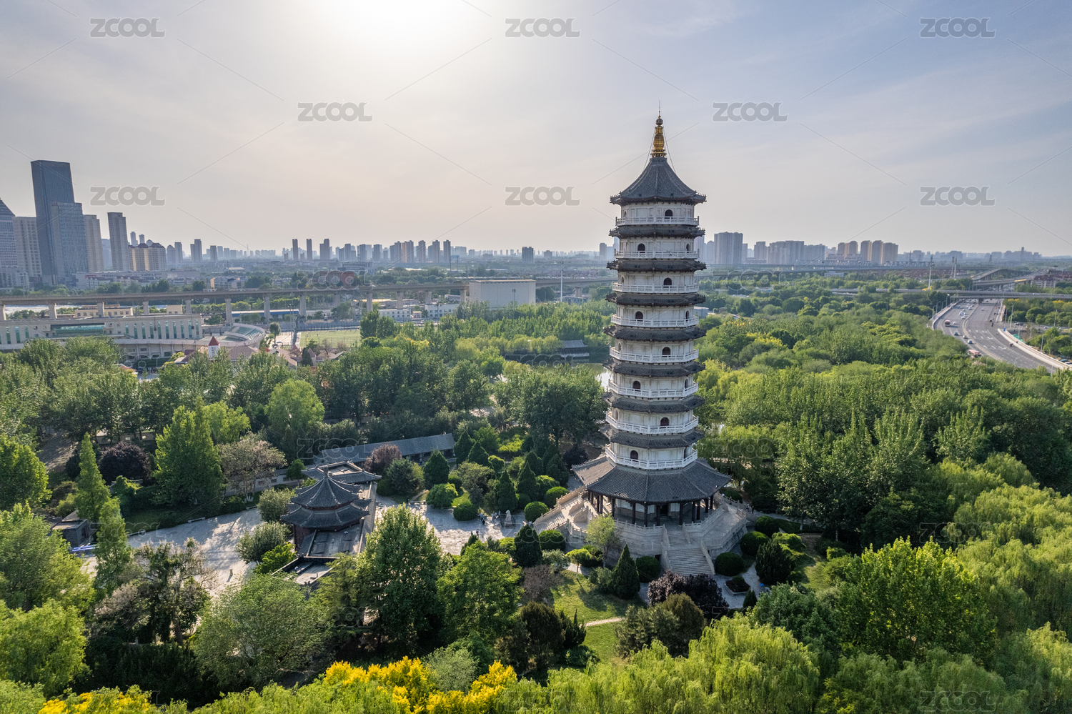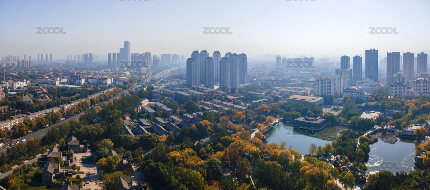 中國(guó)天津?qū)巿@的江南林園和城市建筑航拍圖