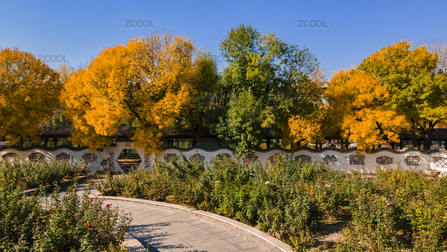 中國(guó)天津?qū)巿@的金黃色秋色航拍俯視圖
