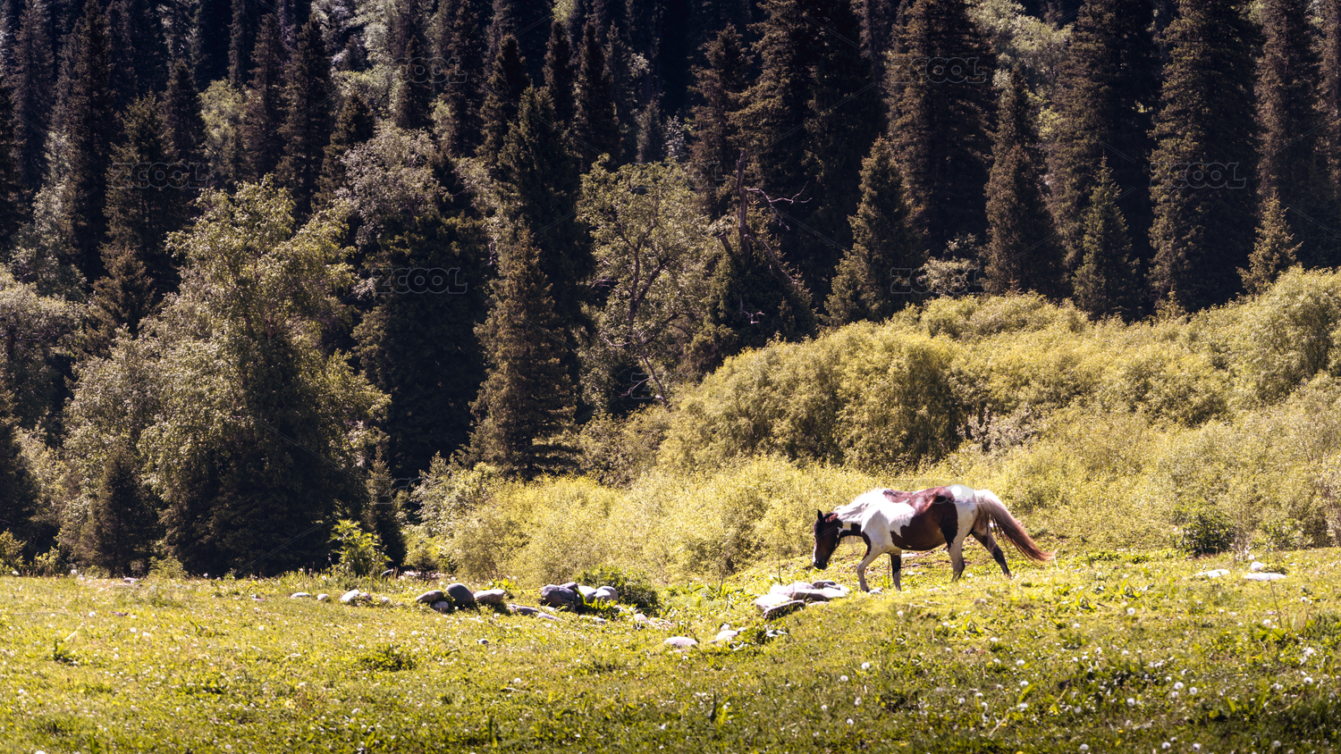 新疆伊犁獨(dú)庫公路那拉提鎮(zhèn)附近,正午時(shí)分,在樹木和森林的環(huán)抱下,一只有斑紋的馬兒閑適地進(jìn)食