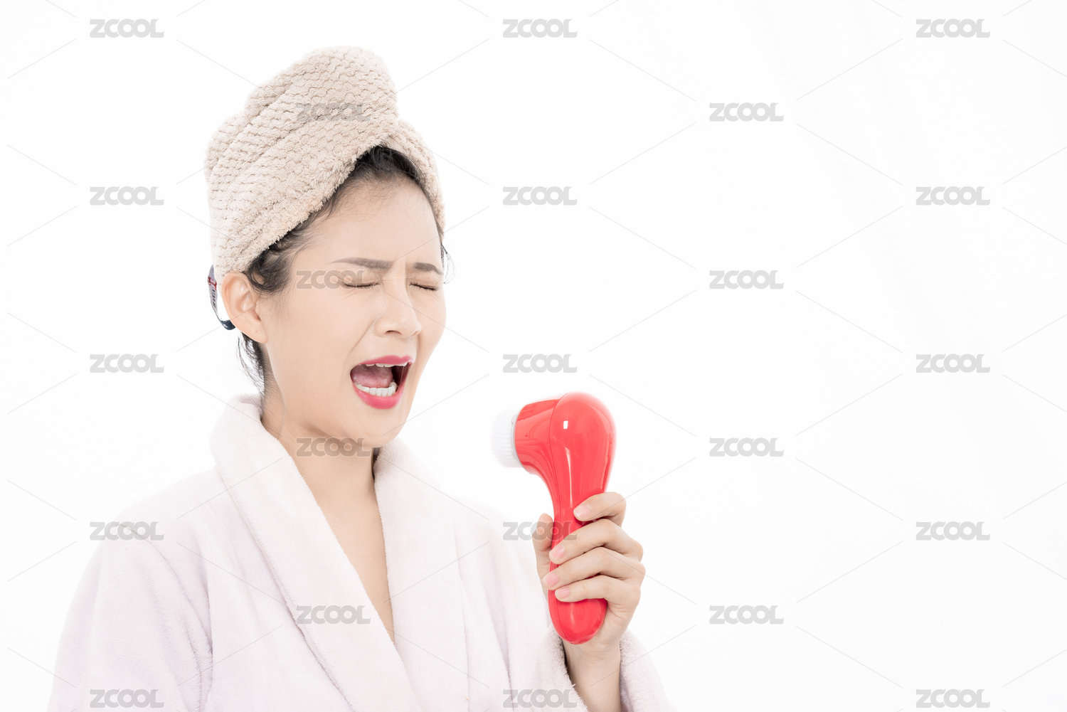 用潔面儀當(dāng)話筒唱歌的年輕女性