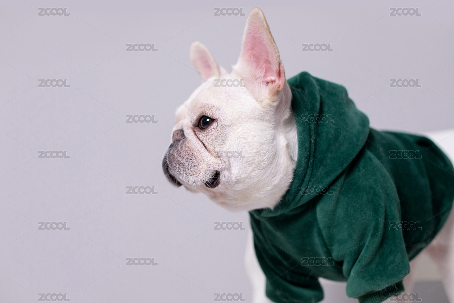 穿衣服的可愛白色法斗站在灰色背景前發(fā)呆