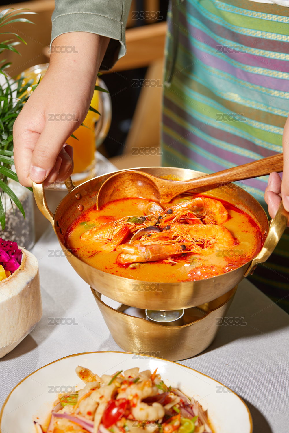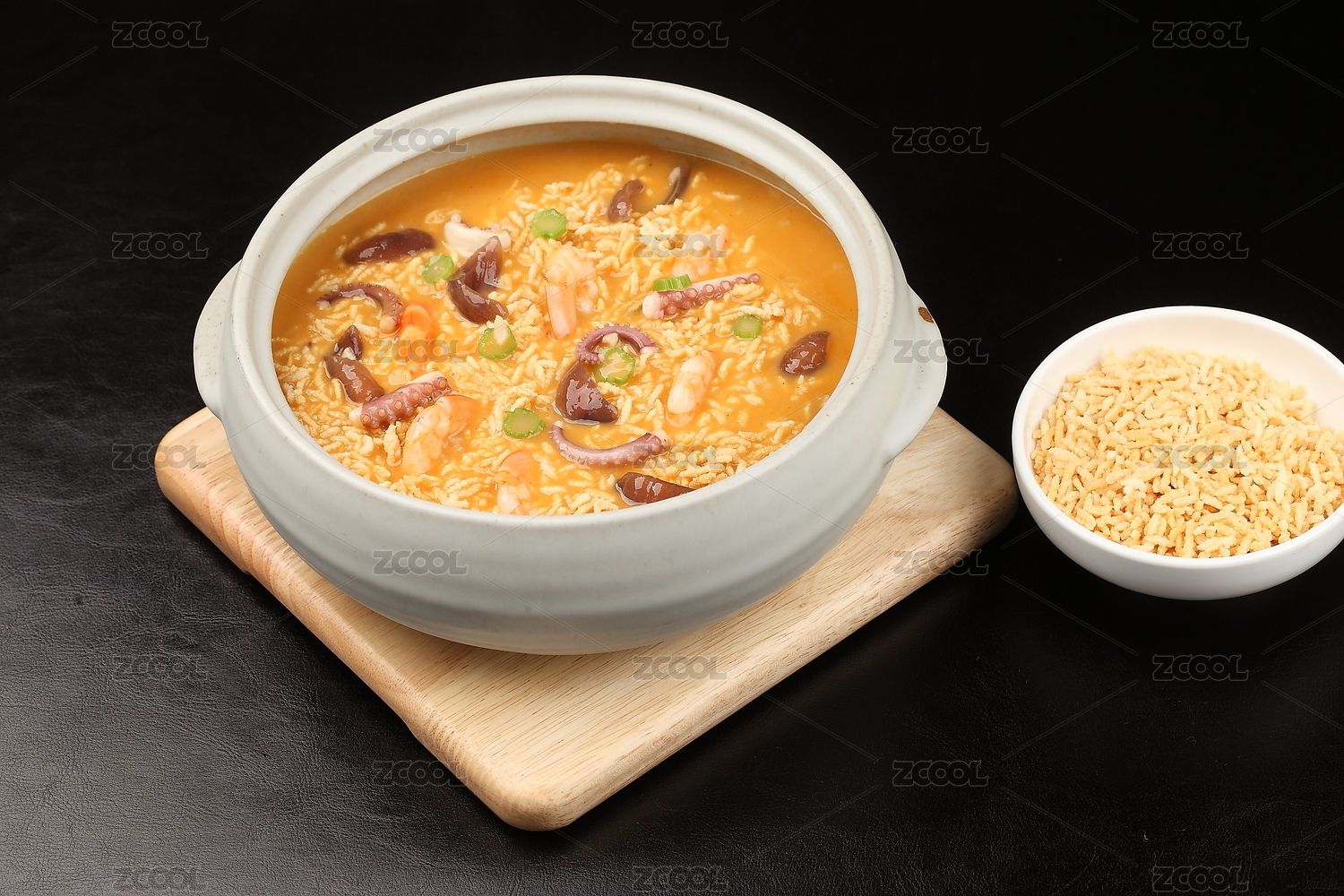 中國(guó)廣東一道粵菜——蝦湯海鮮脆米泡飯