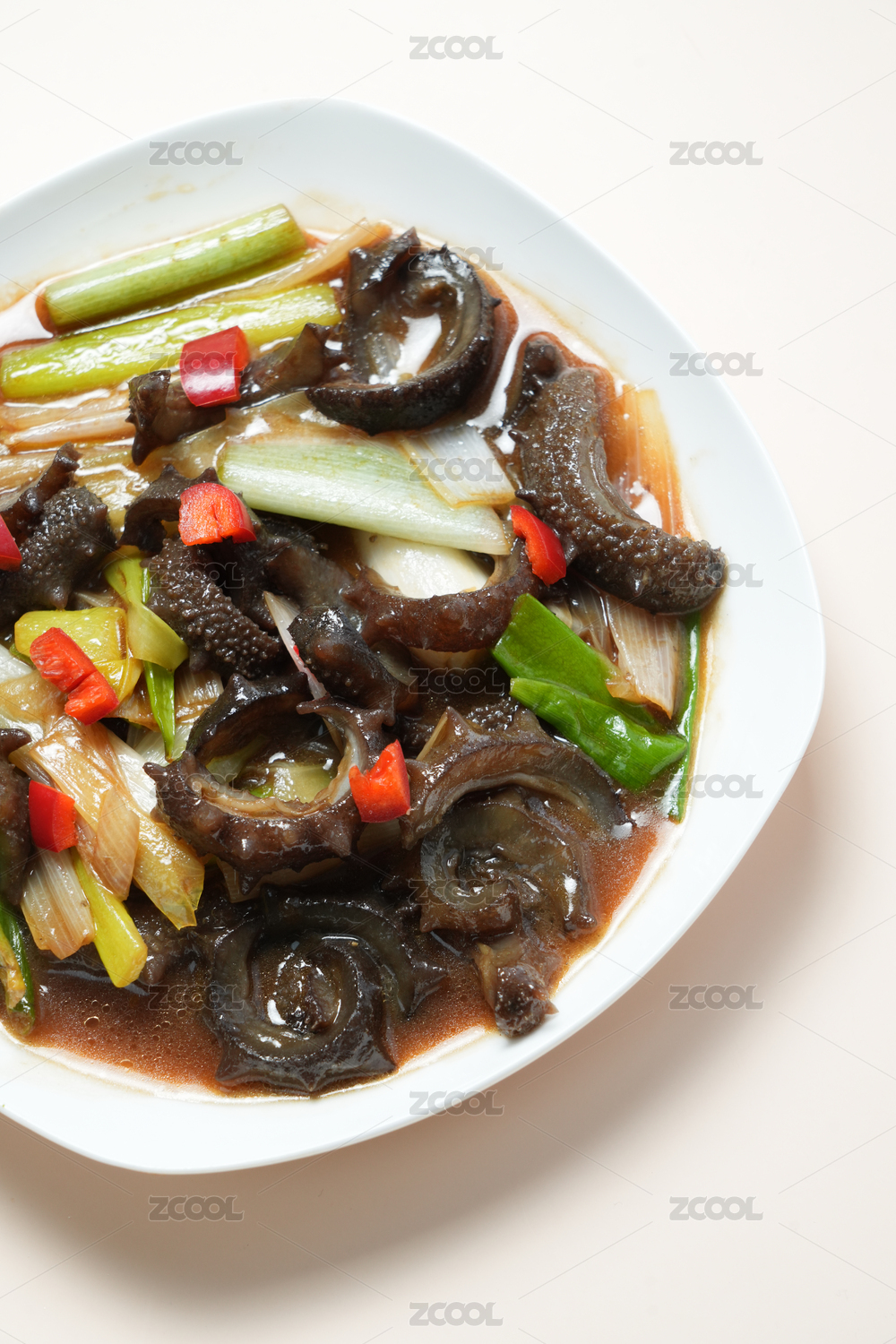 一盤美味的蔥燒海參放在盤子中