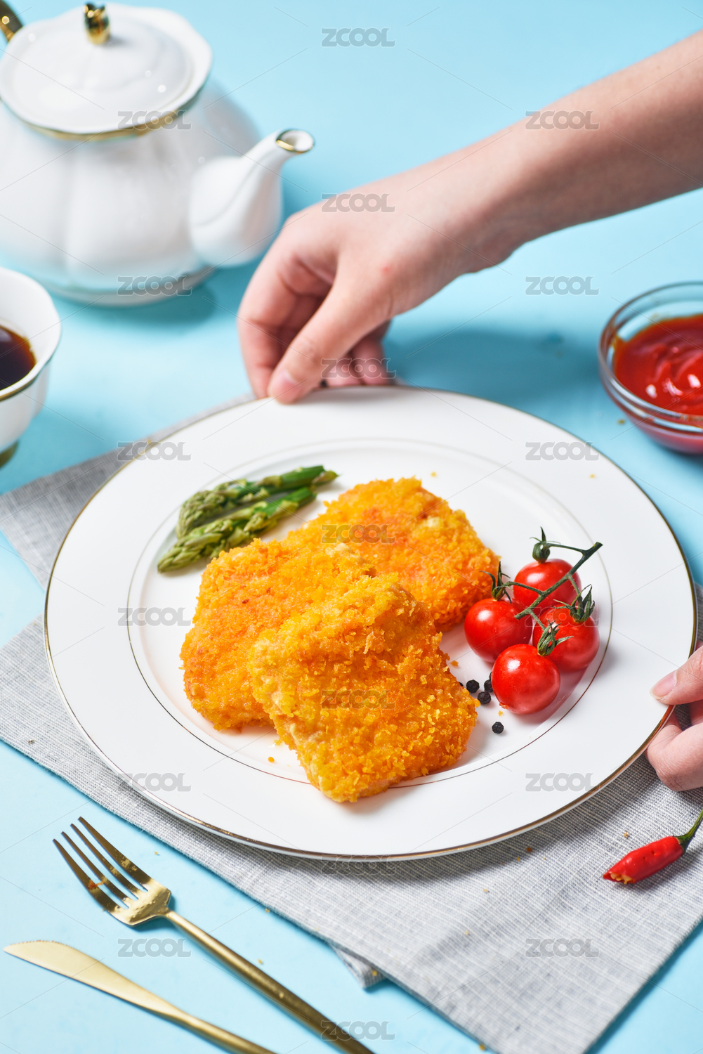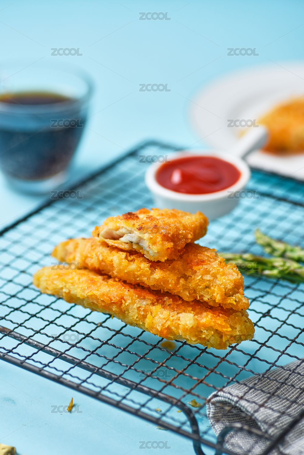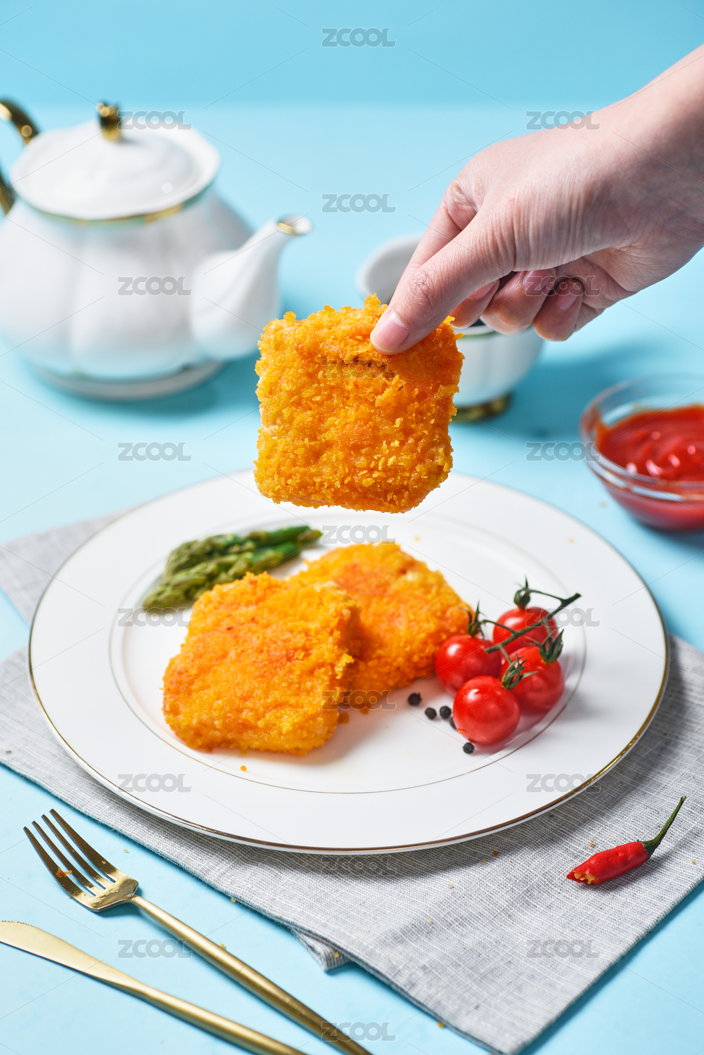 純色背景盤子里炸鱈魚的特寫鏡頭