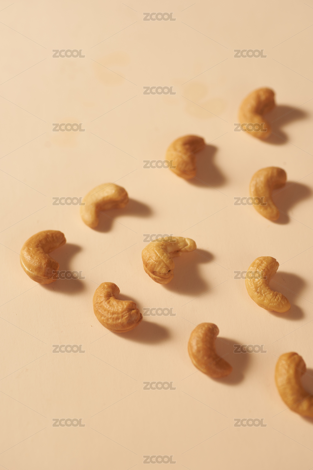 純色背景上平鋪排列整齊的腰果特寫鏡頭