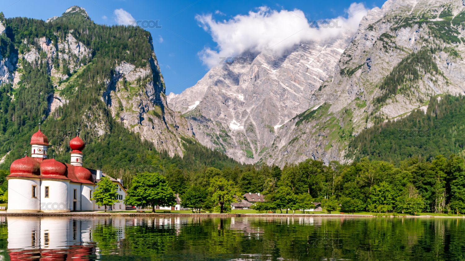 德國國王湖,碧綠的湖水與紅頂教堂和背后的森林山脈