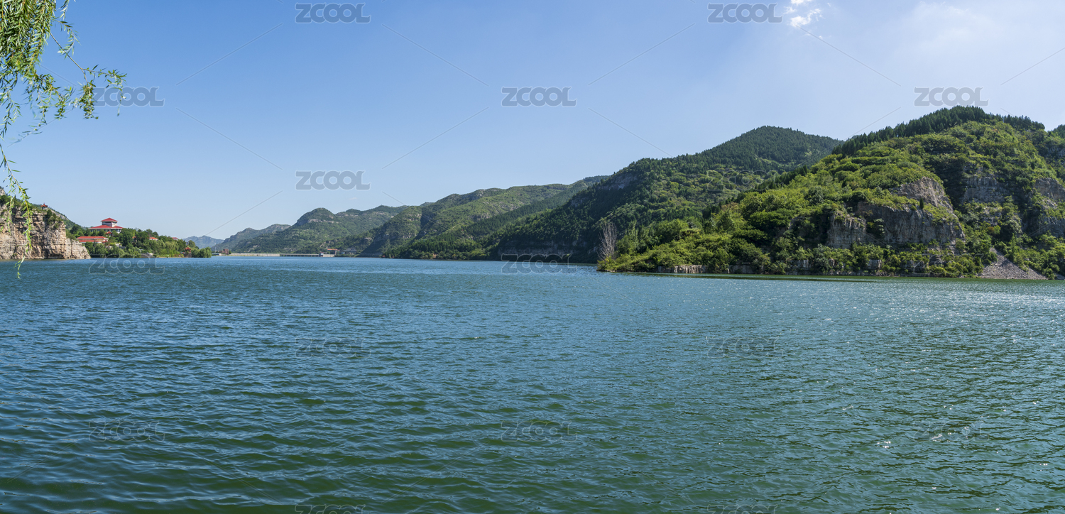晴朗天氣下的綠色山川和碧綠的湖水