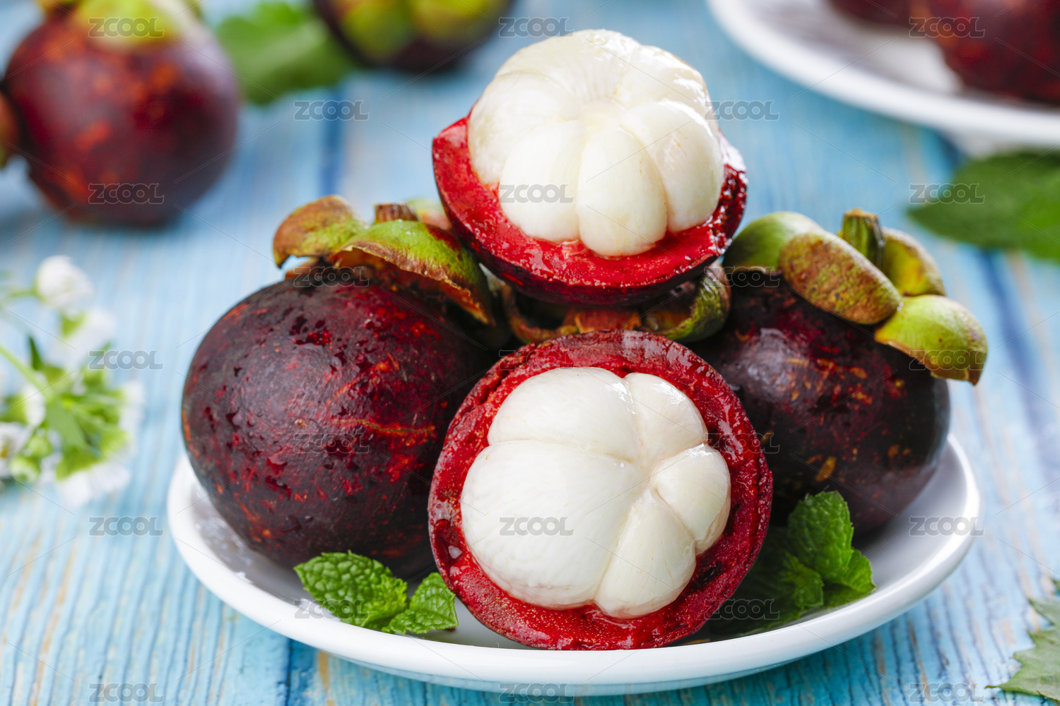 白底上放著一堆泰國(guó)山竹和剝開(kāi)的山竹