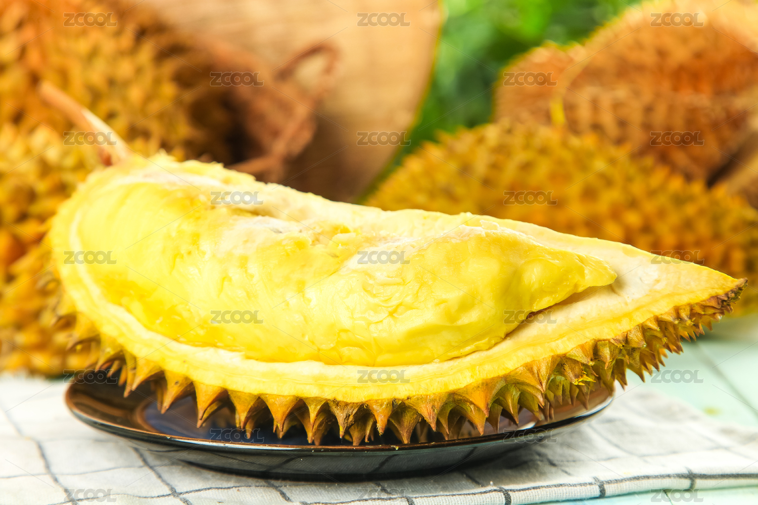 格子底上盤(pán)子里放著半邊泰國(guó)金枕頭榴蓮