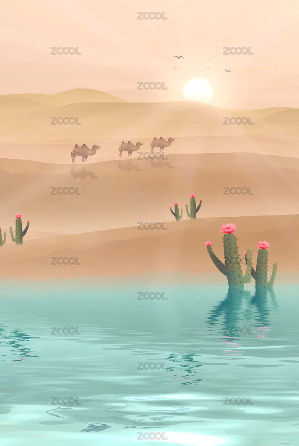 炎熱夏天太陽(yáng)照耀整片天空,駱駝商隊(duì)在干旱沙漠里尋找水源中國(guó)風(fēng)插畫背景海報(bào)