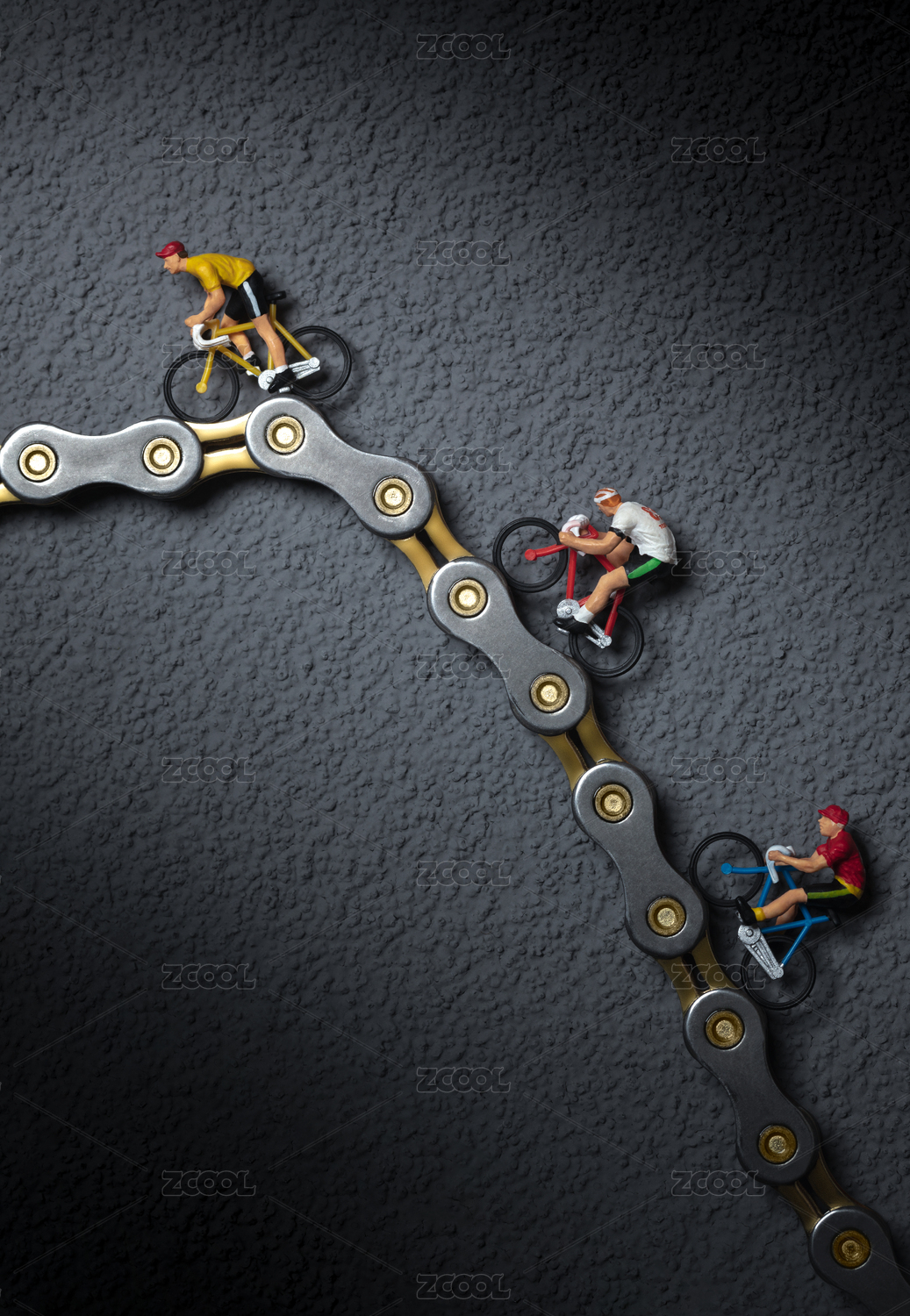 微縮創(chuàng)意在自行車鏈條上爬坡的公路車選手