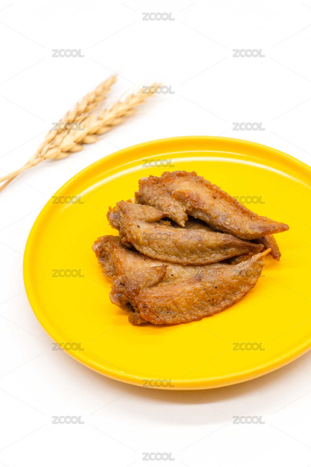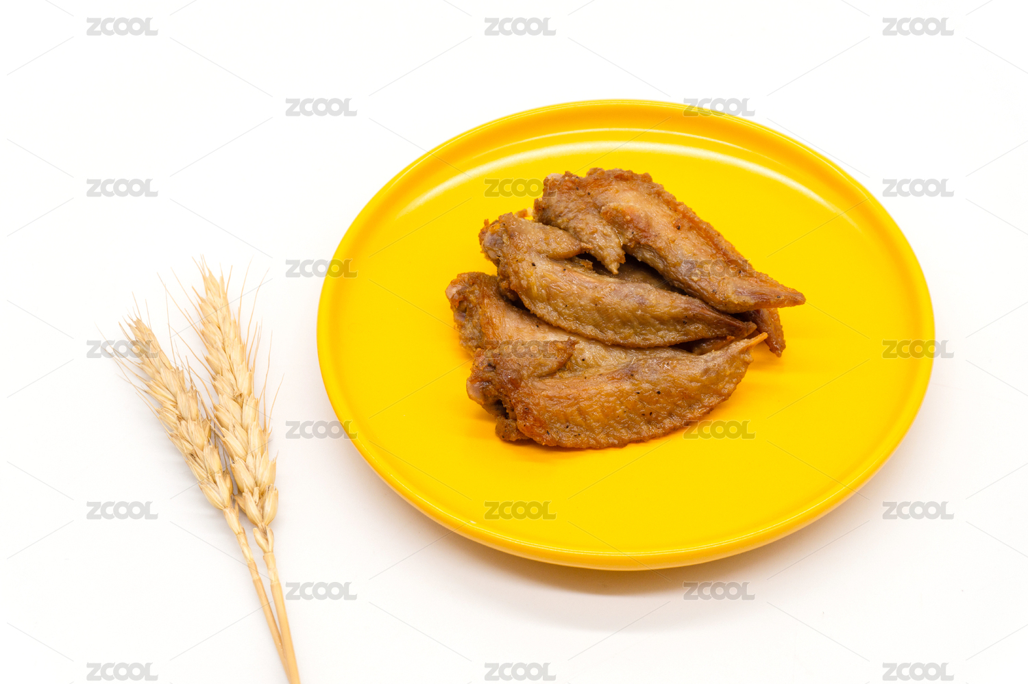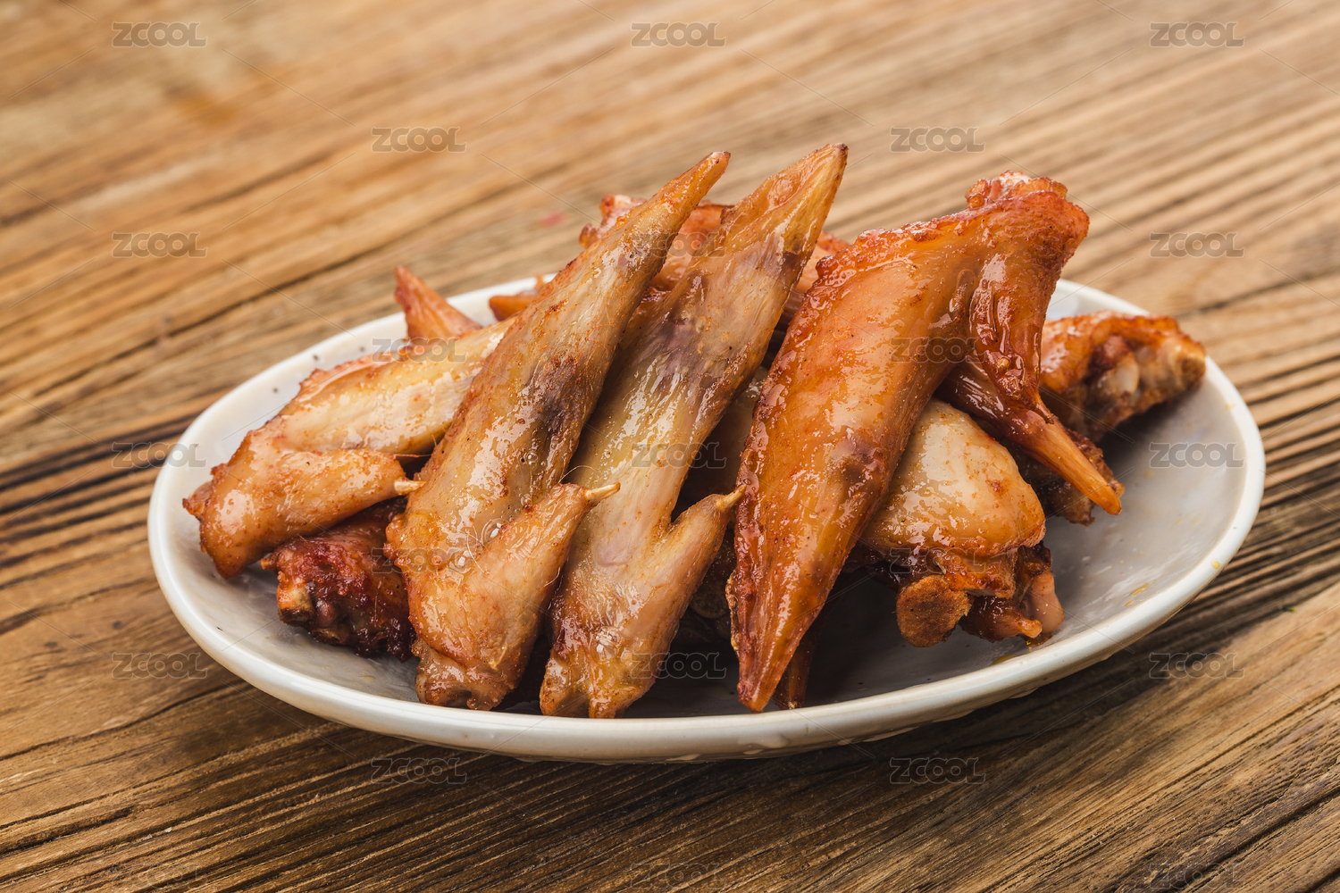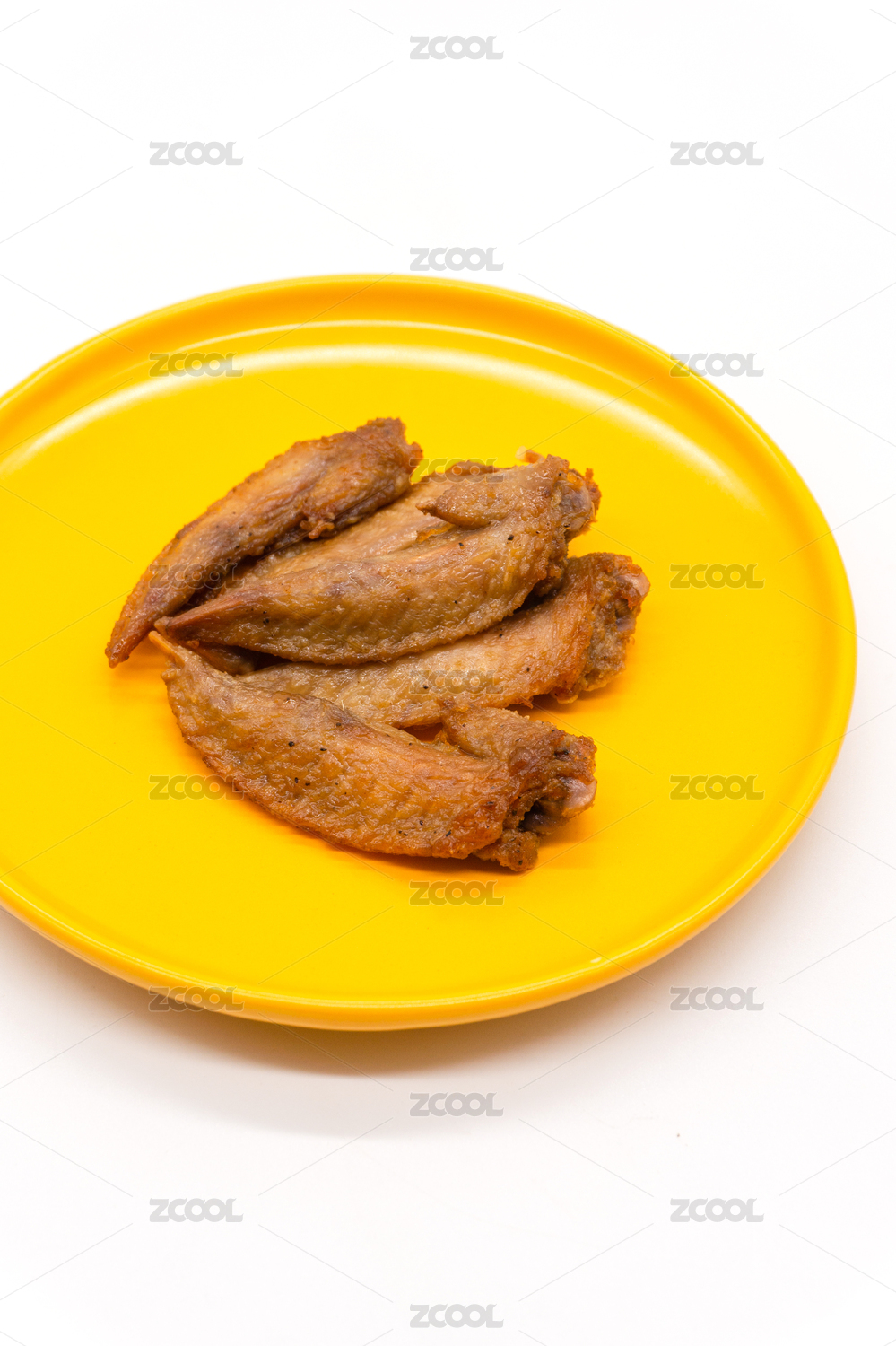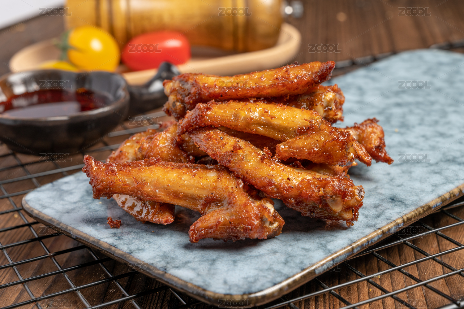 桌面上的盤子里的美味可口的鹽焗雞翅尖