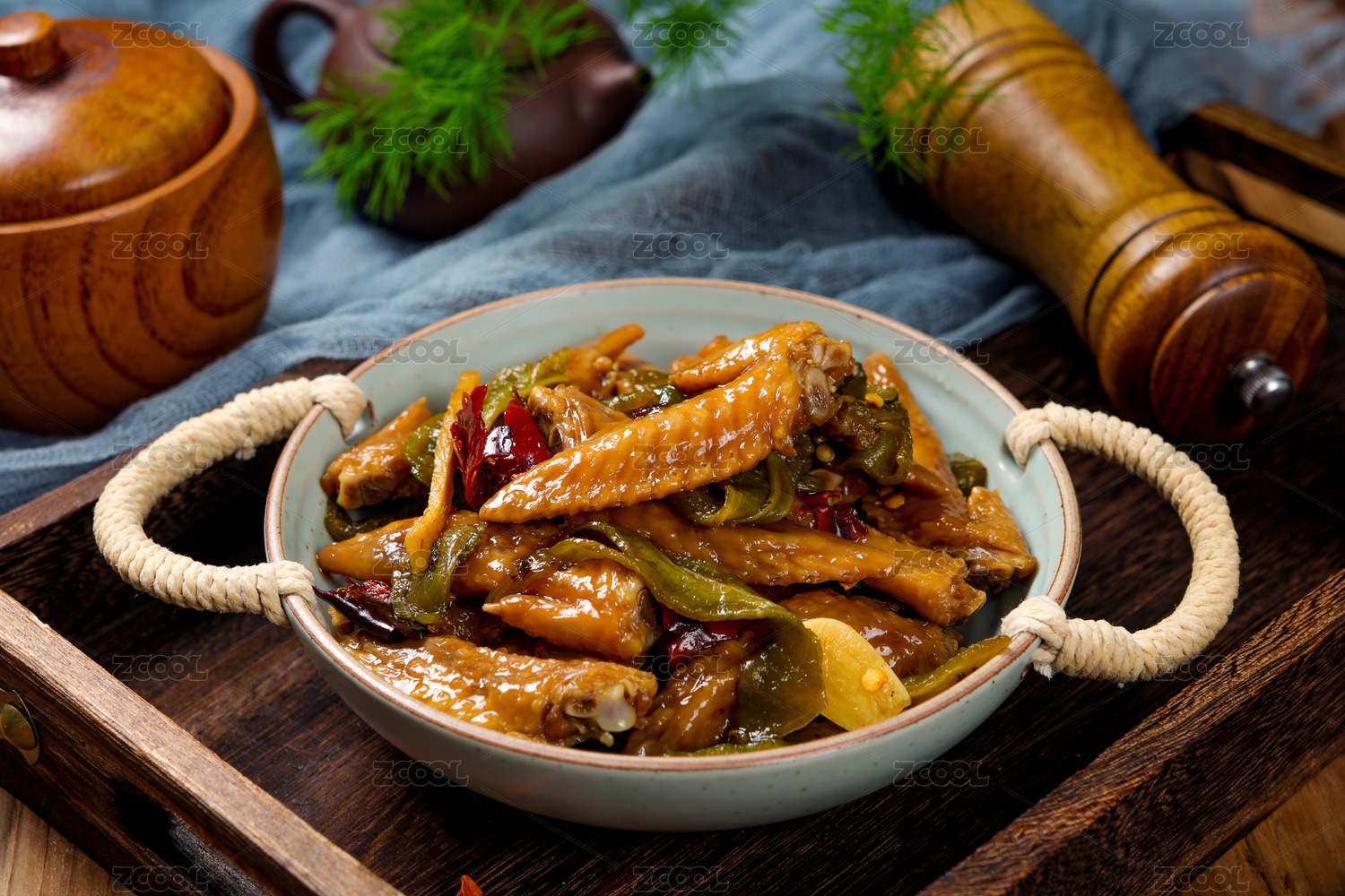木桌上放在白瓷盤里的川味麻辣鹵雞翅尖