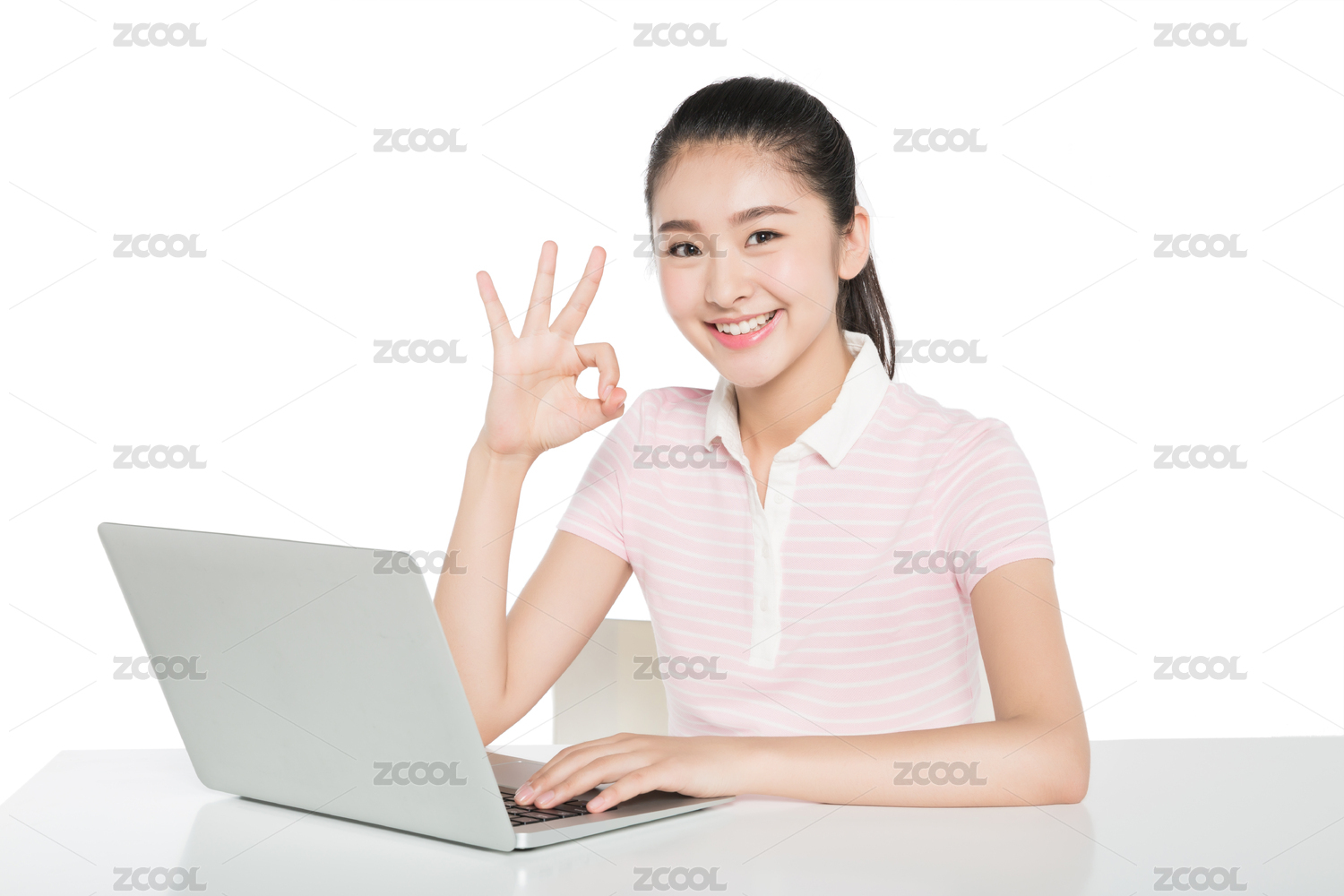 影棚拍攝,使用筆記本電腦的年輕女學(xué)生