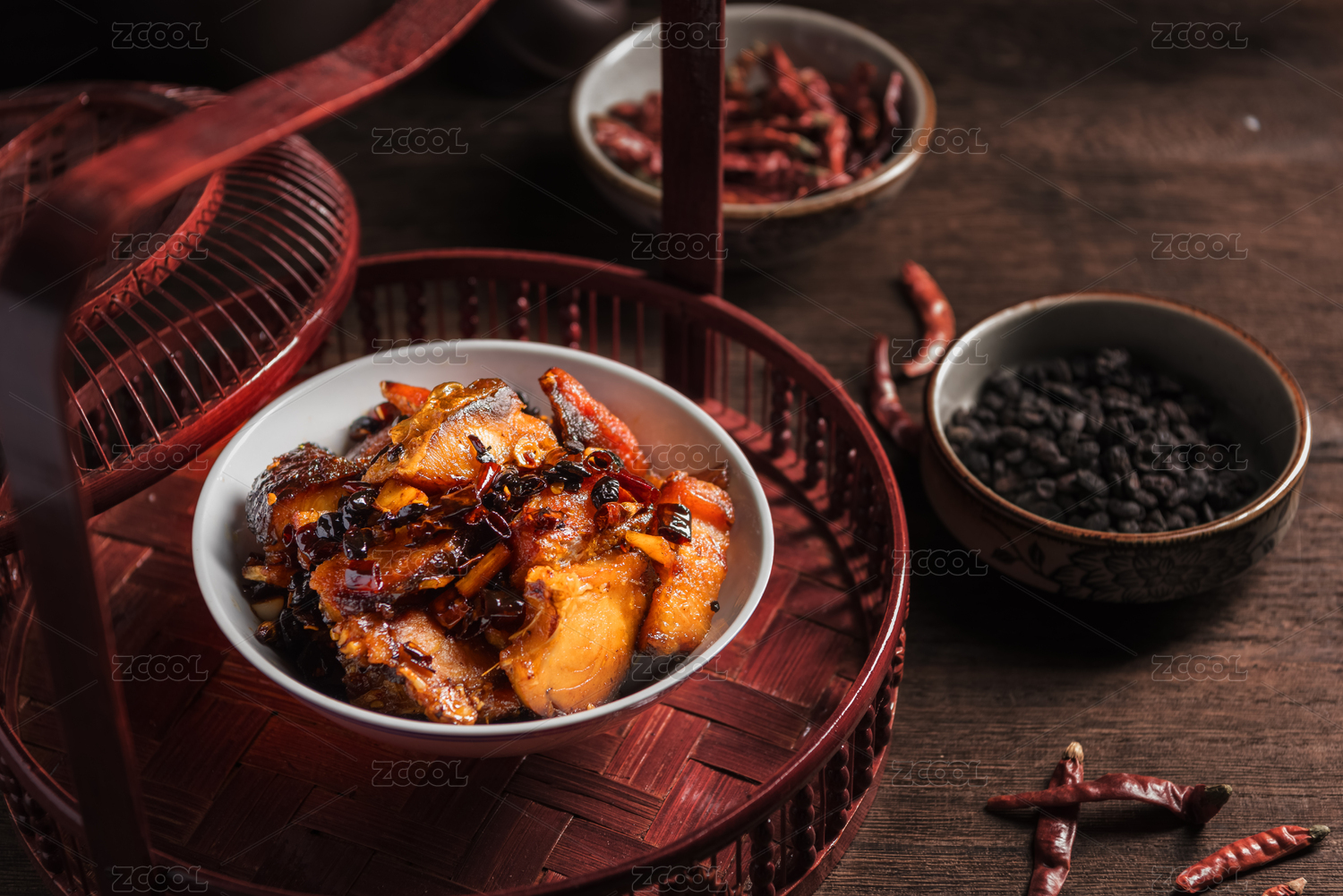 紅色提籃食盒里的豆豉辣椒炒咸魚臘魚