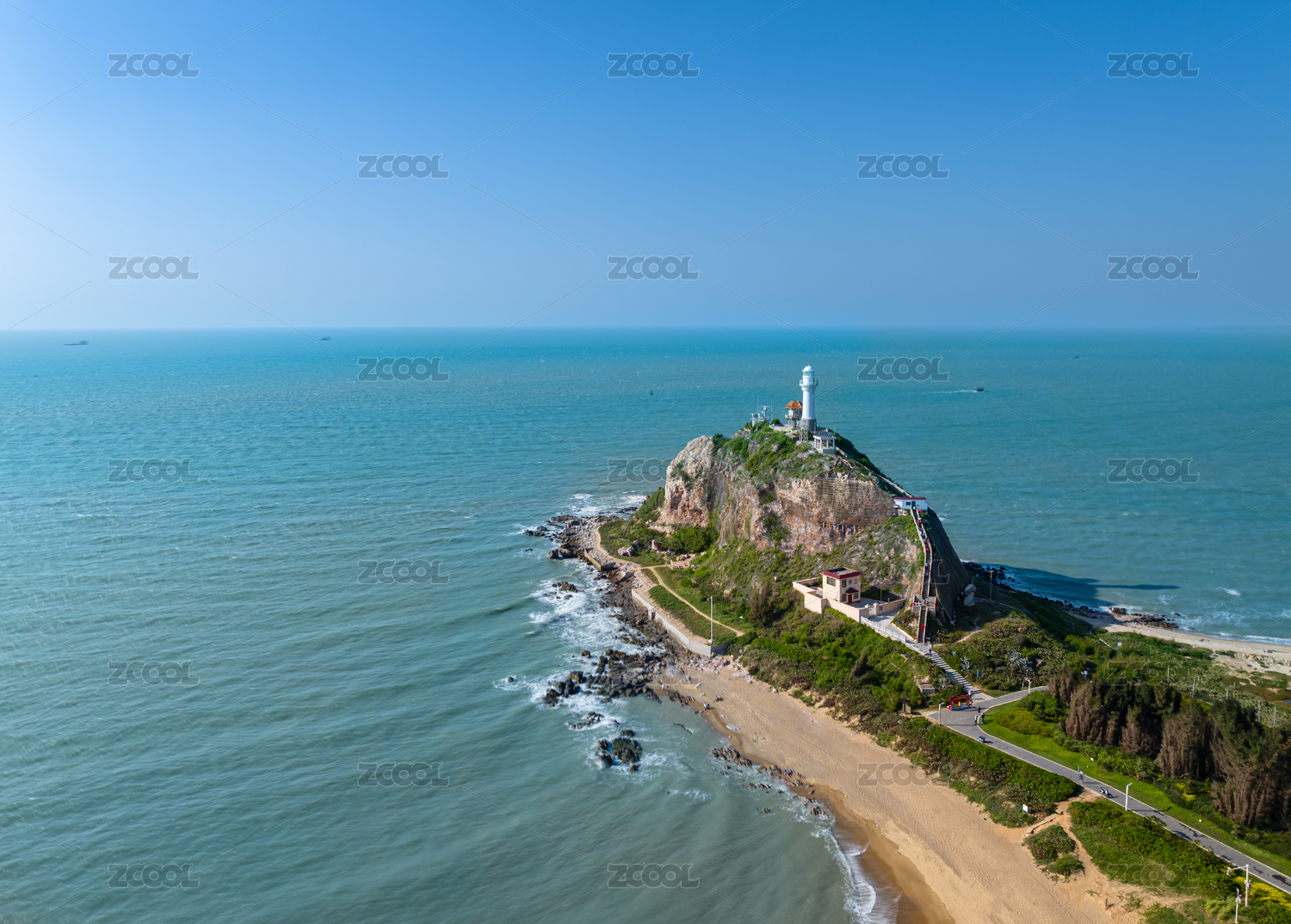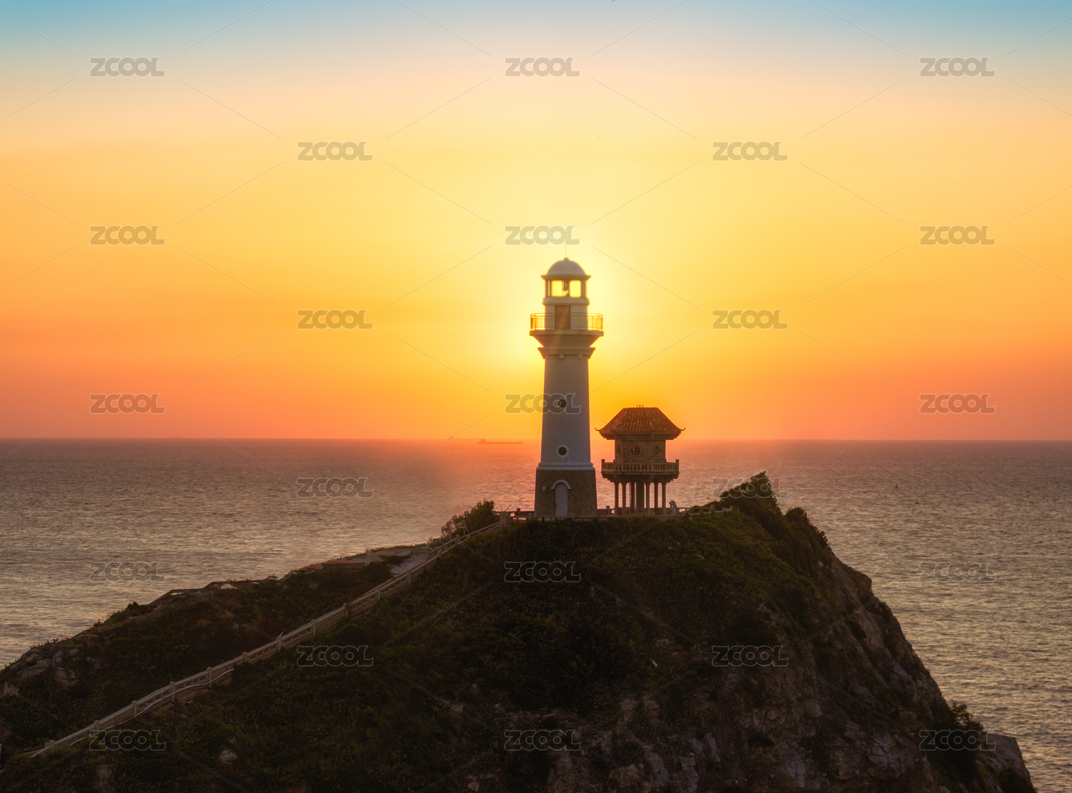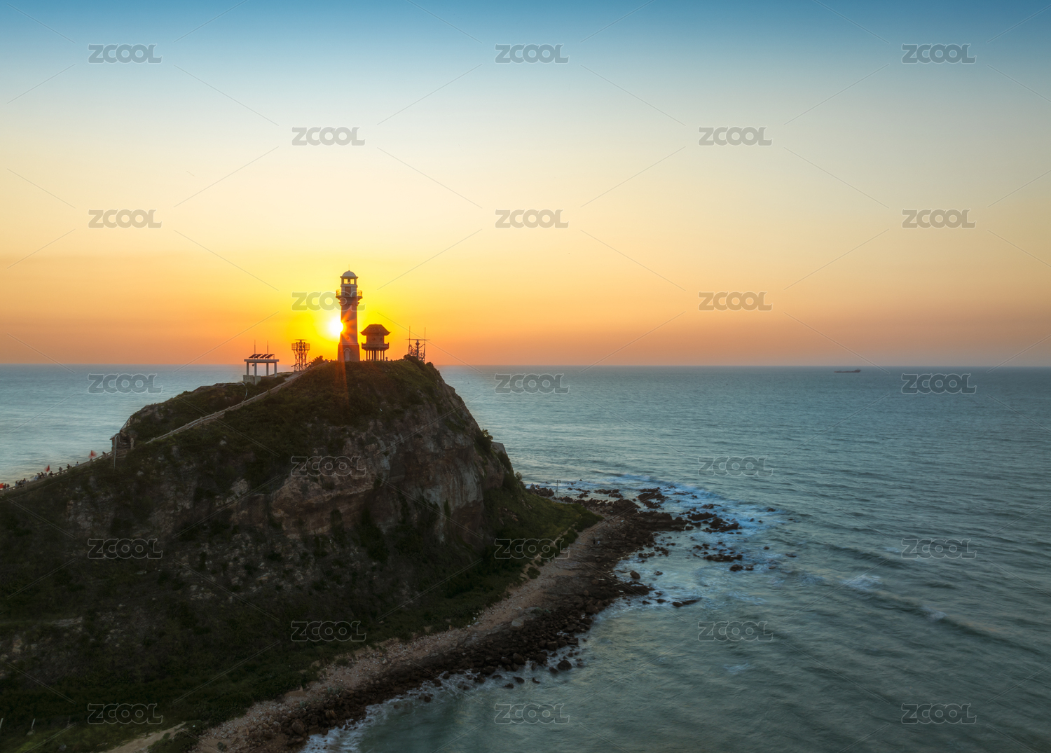 中國海南東方市魚鱗洲燈塔落日航拍圖