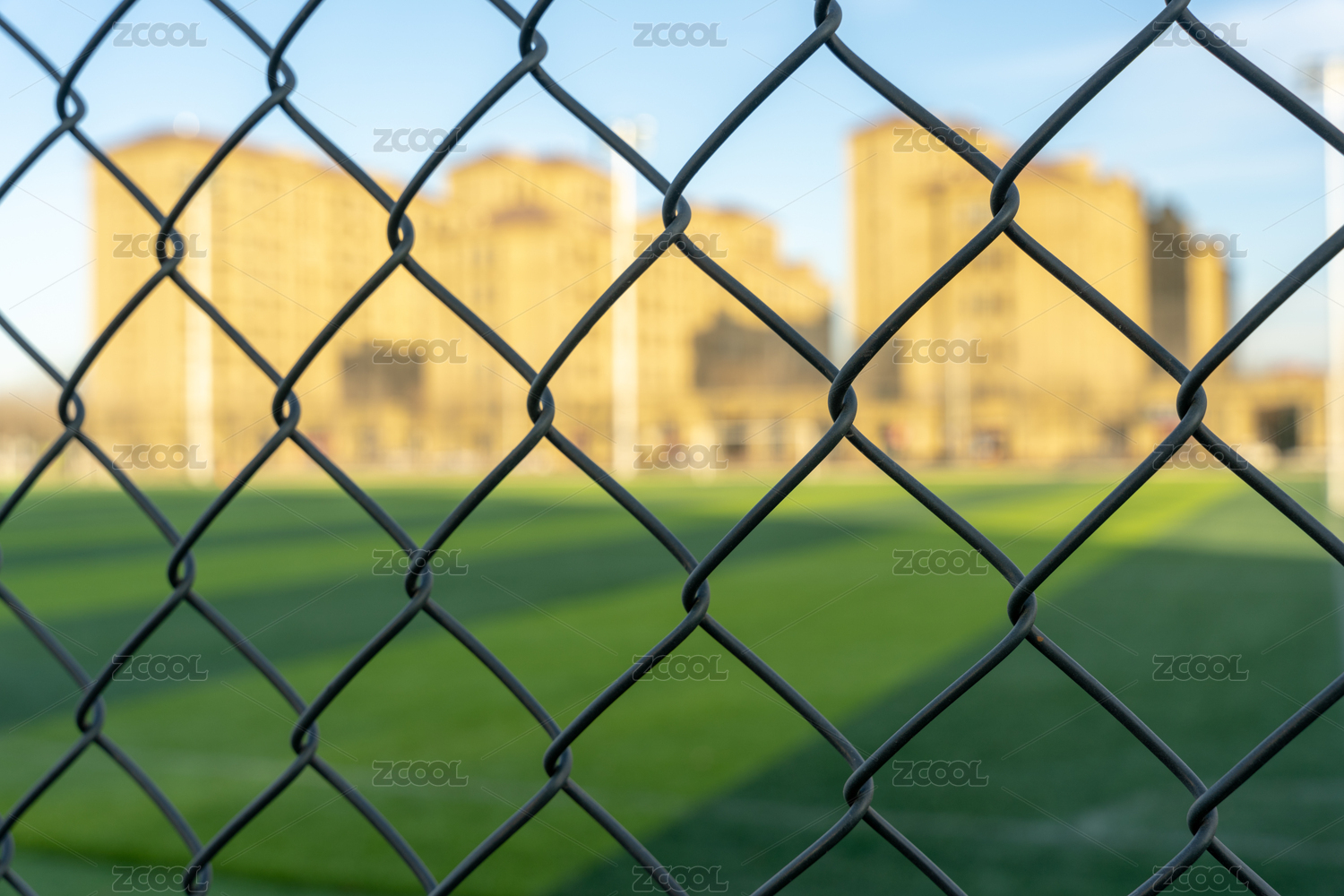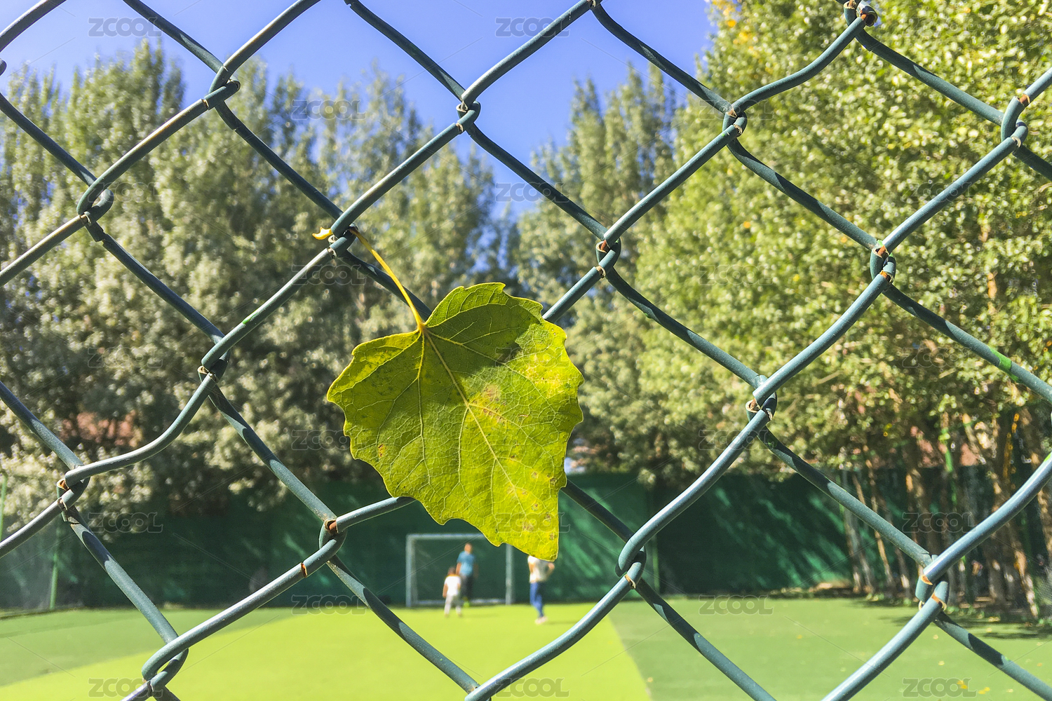 一片黃色的樹葉落在戶外足球場鐵絲網(wǎng)護欄上