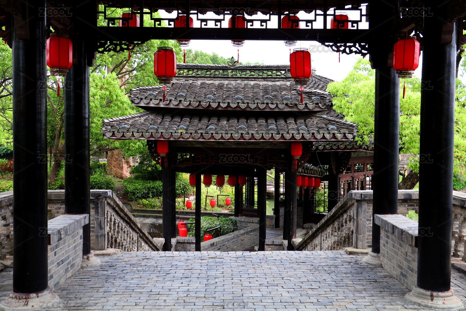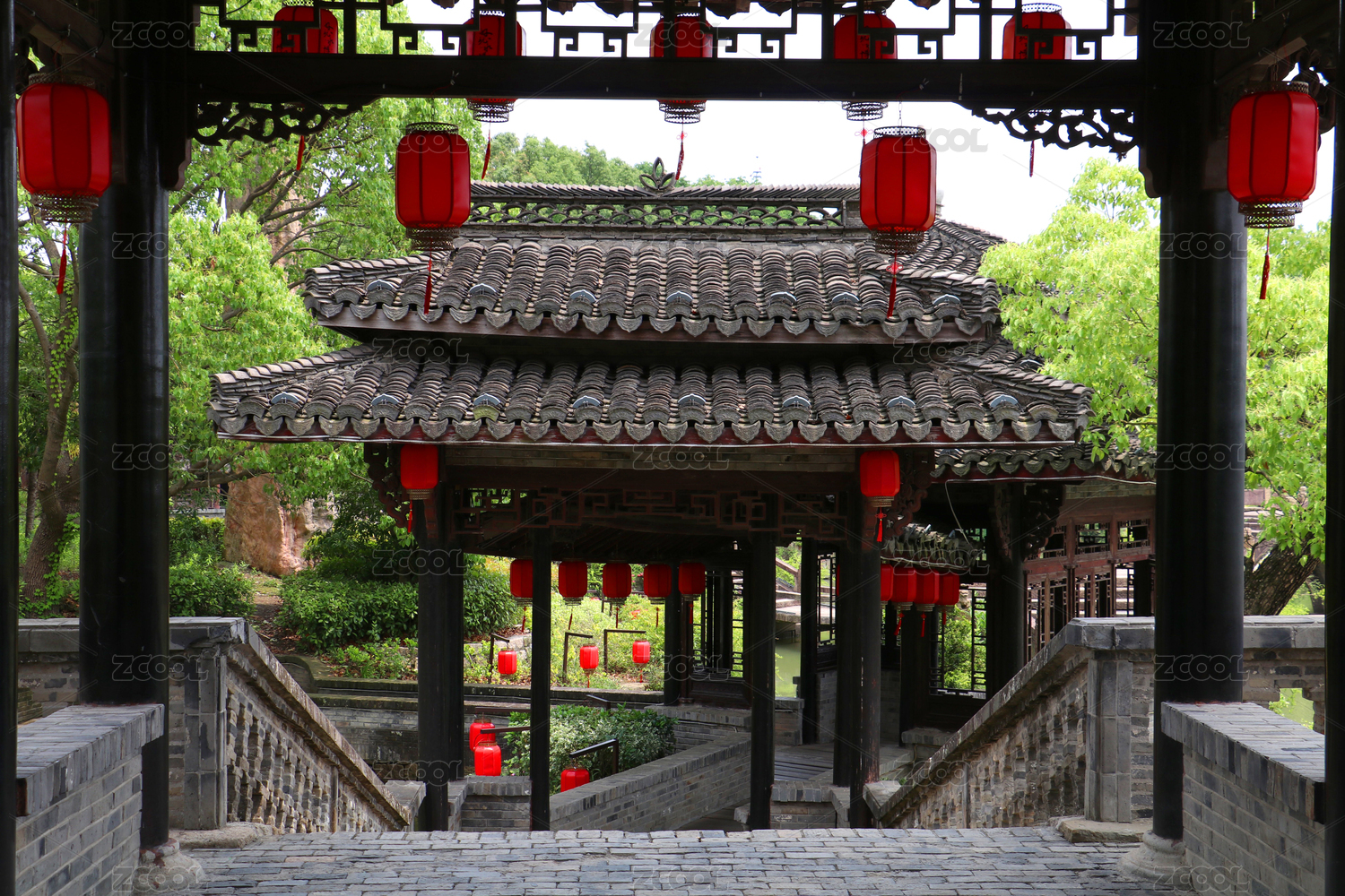 綠蔭環(huán)抱的中式古典廊庭與石橋