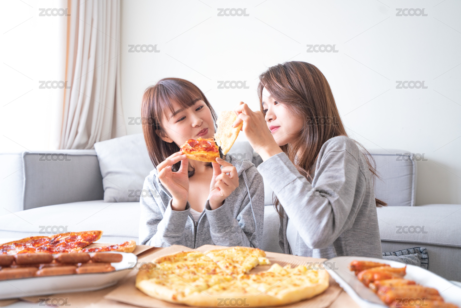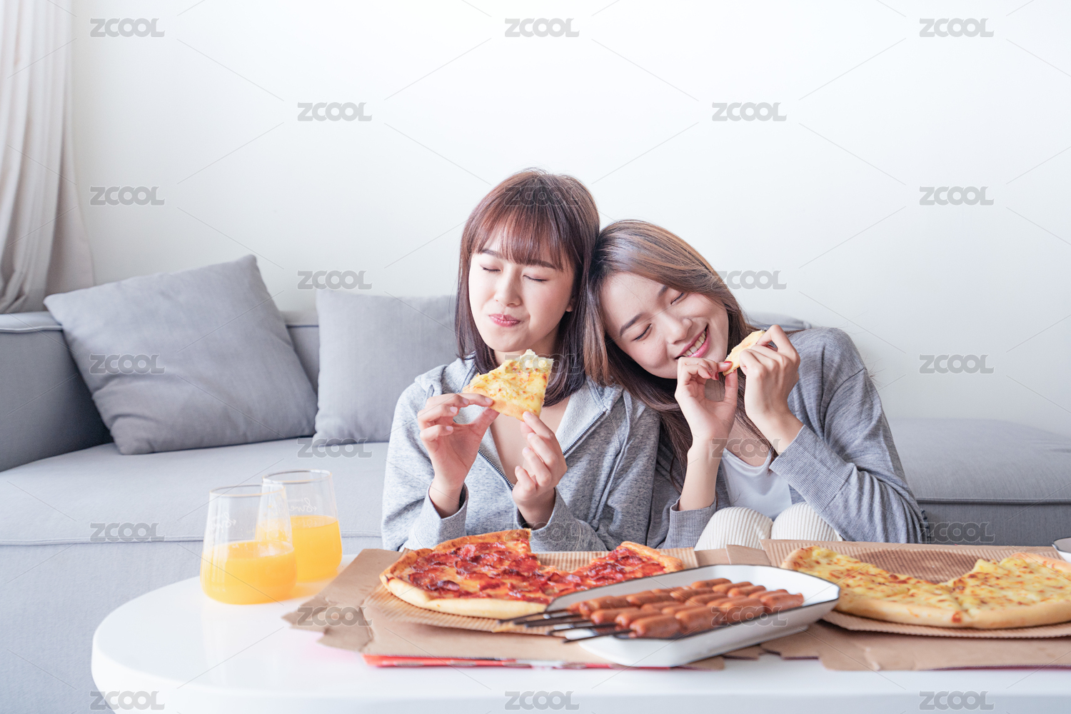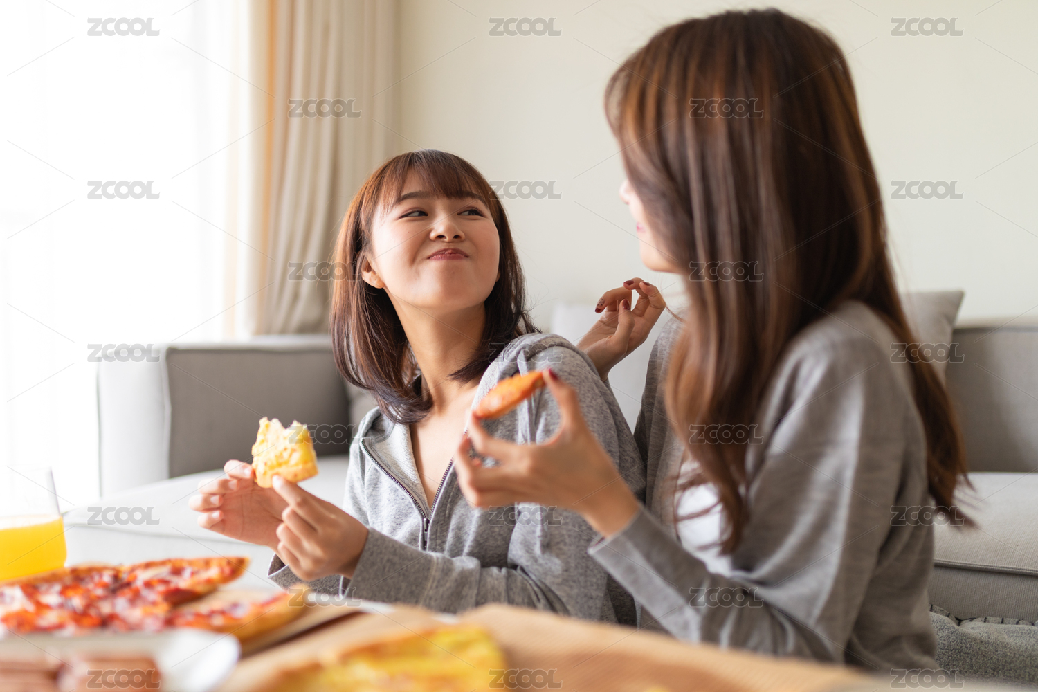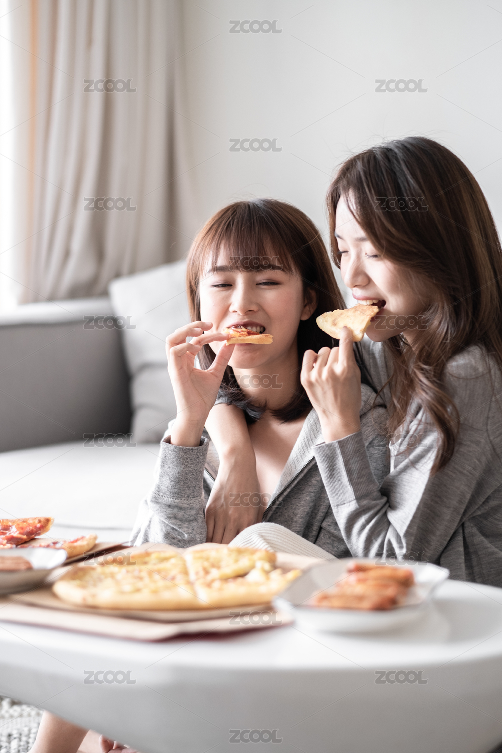 兩位女性閨蜜在客廳沙發(fā)前吃披薩