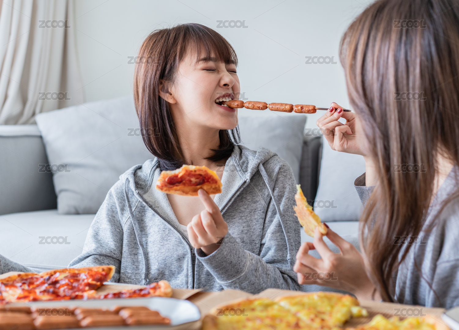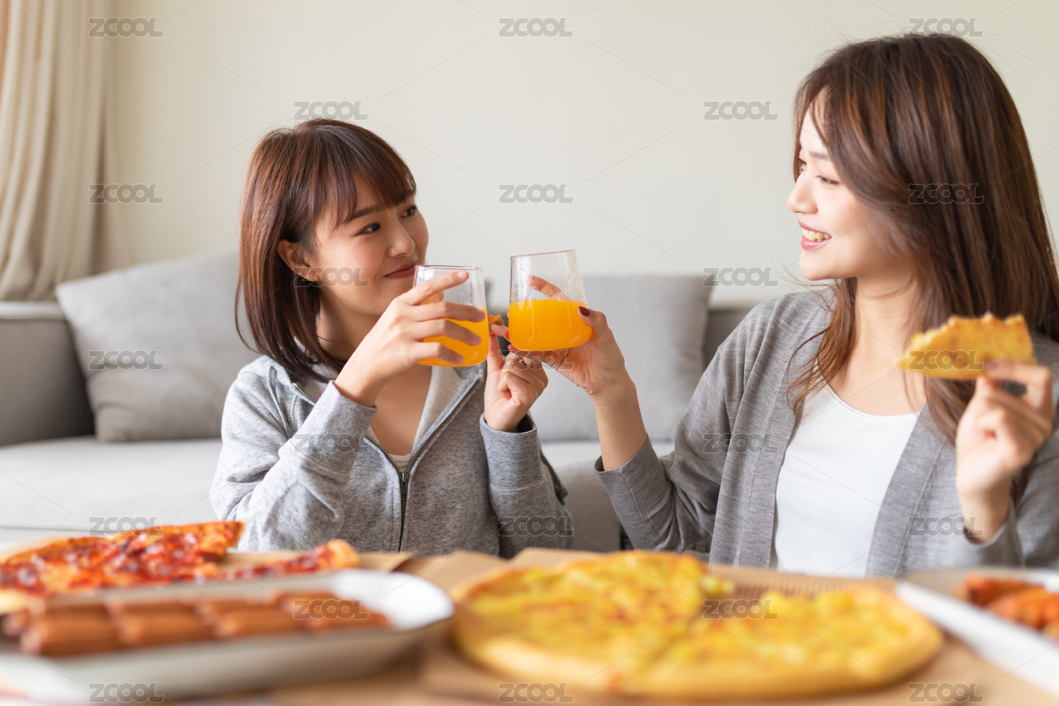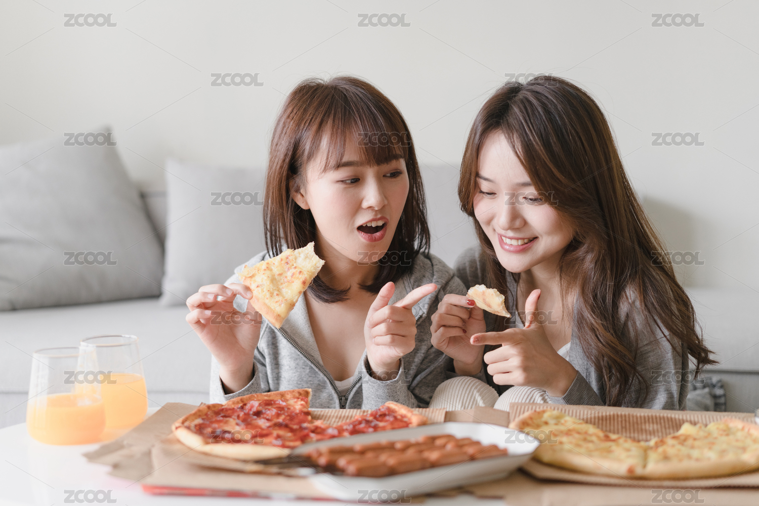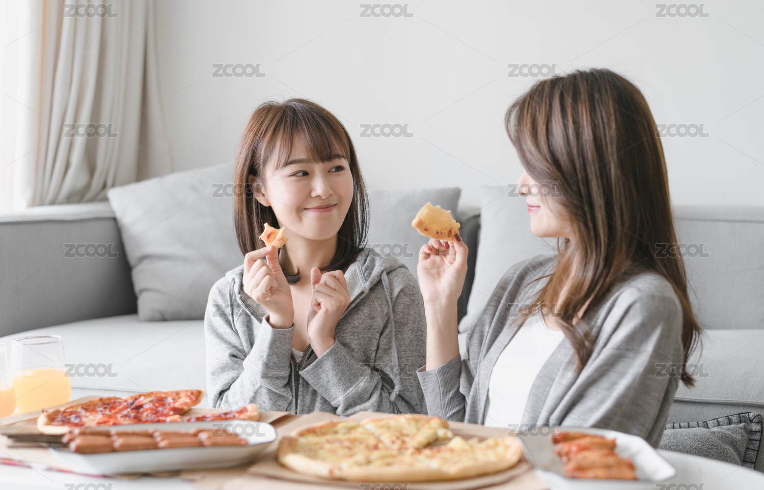 兩位女性閨蜜在客廳沙發(fā)前吃披薩