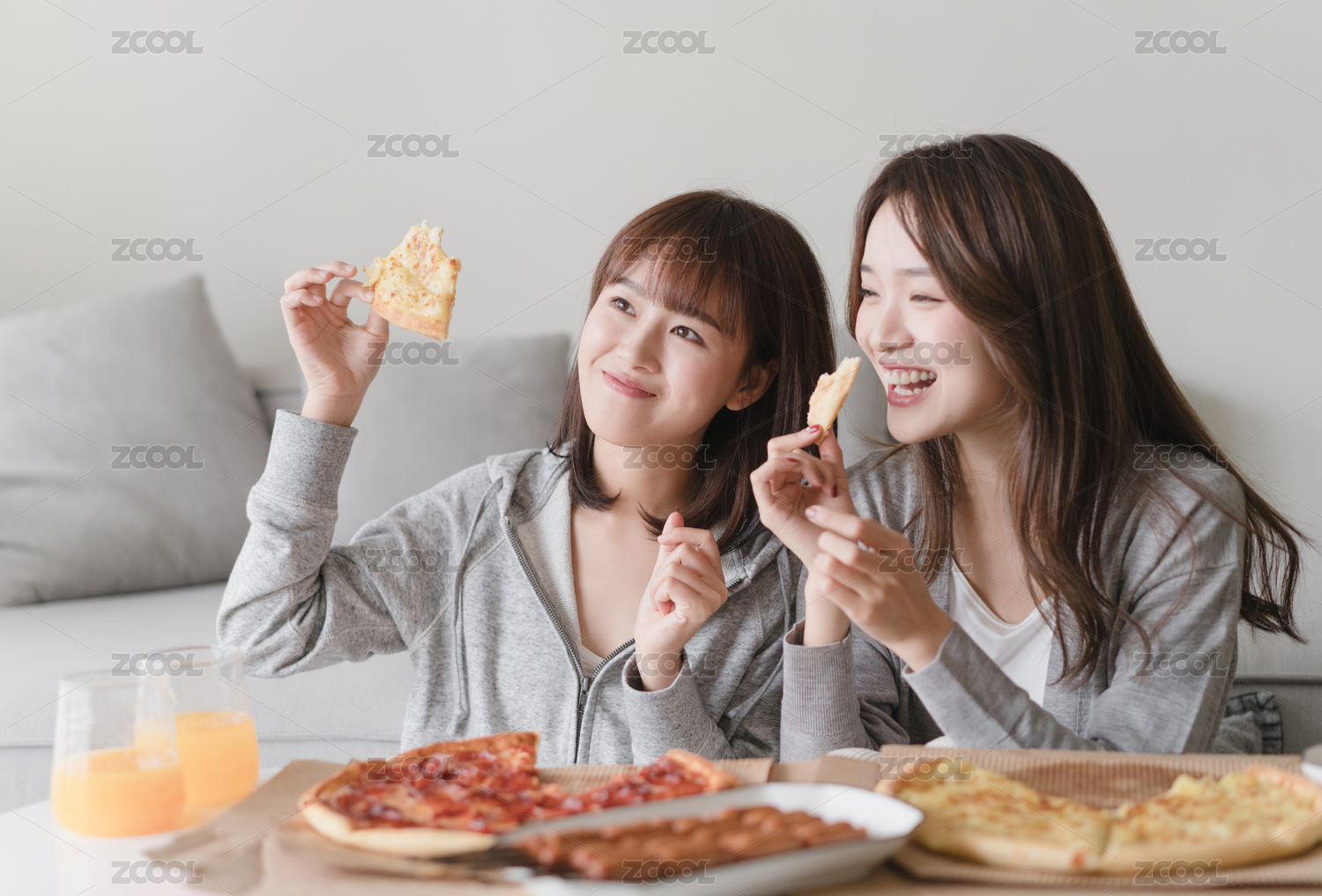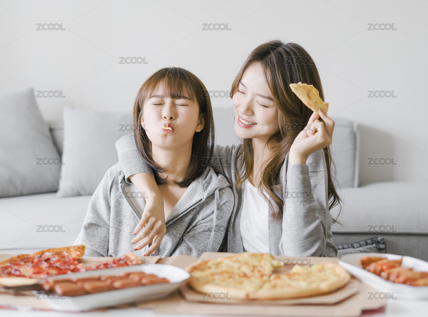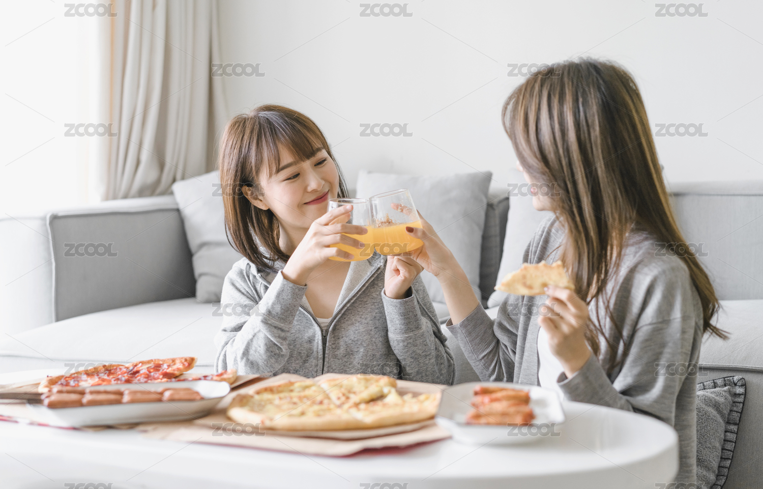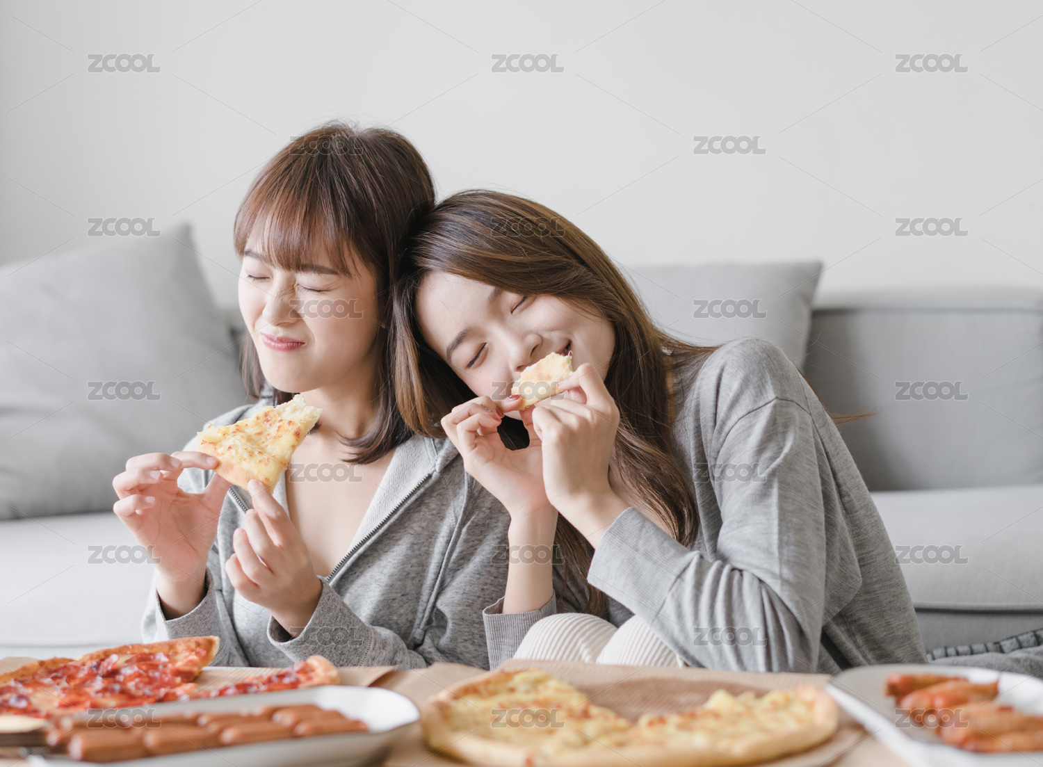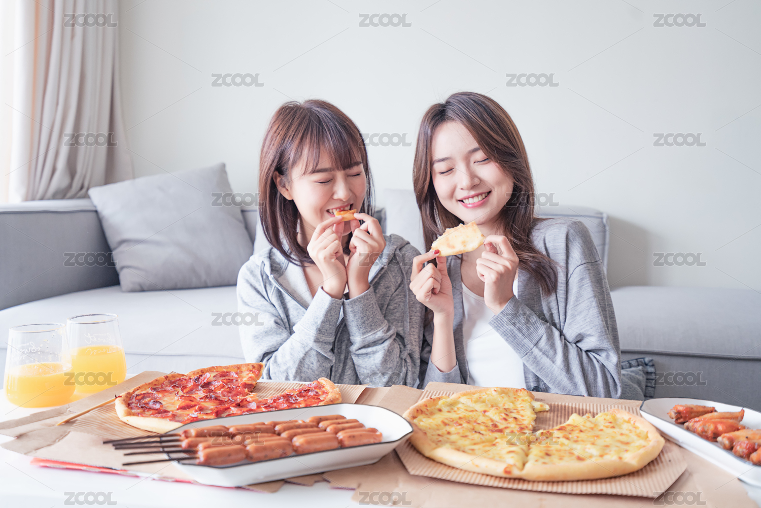 兩位女性閨蜜在客廳沙發(fā)前吃披薩