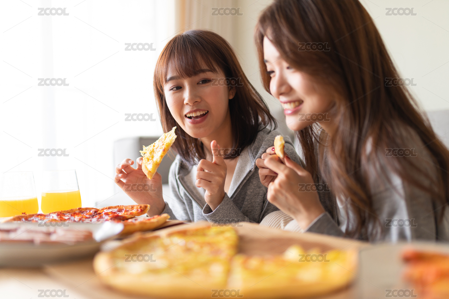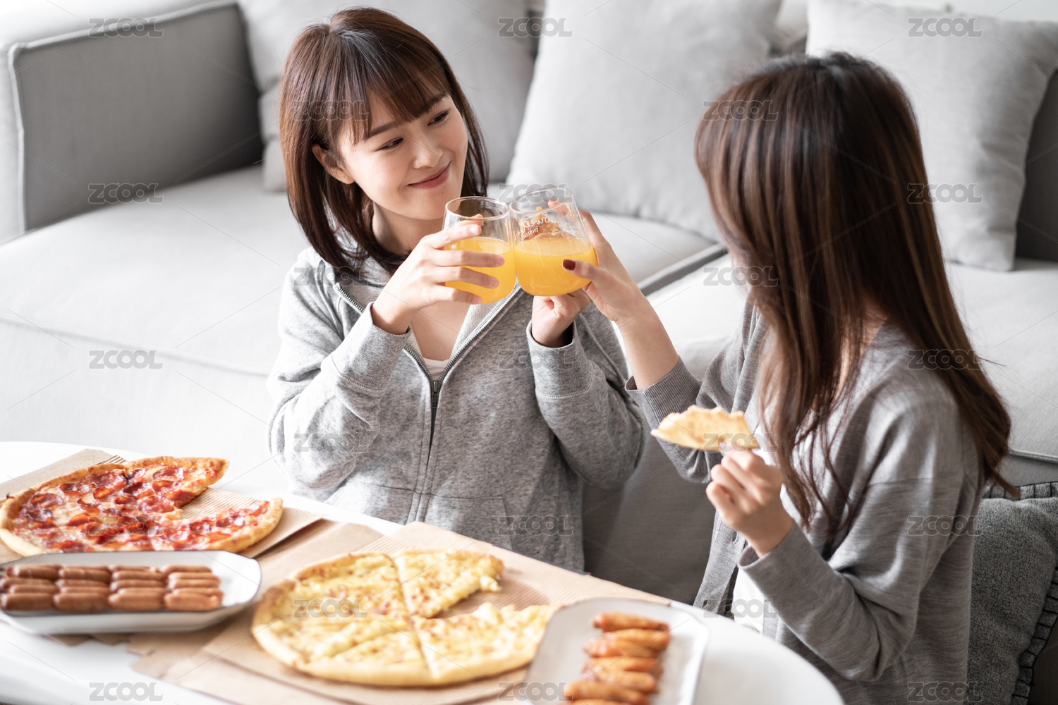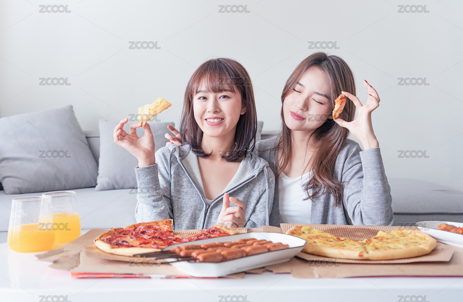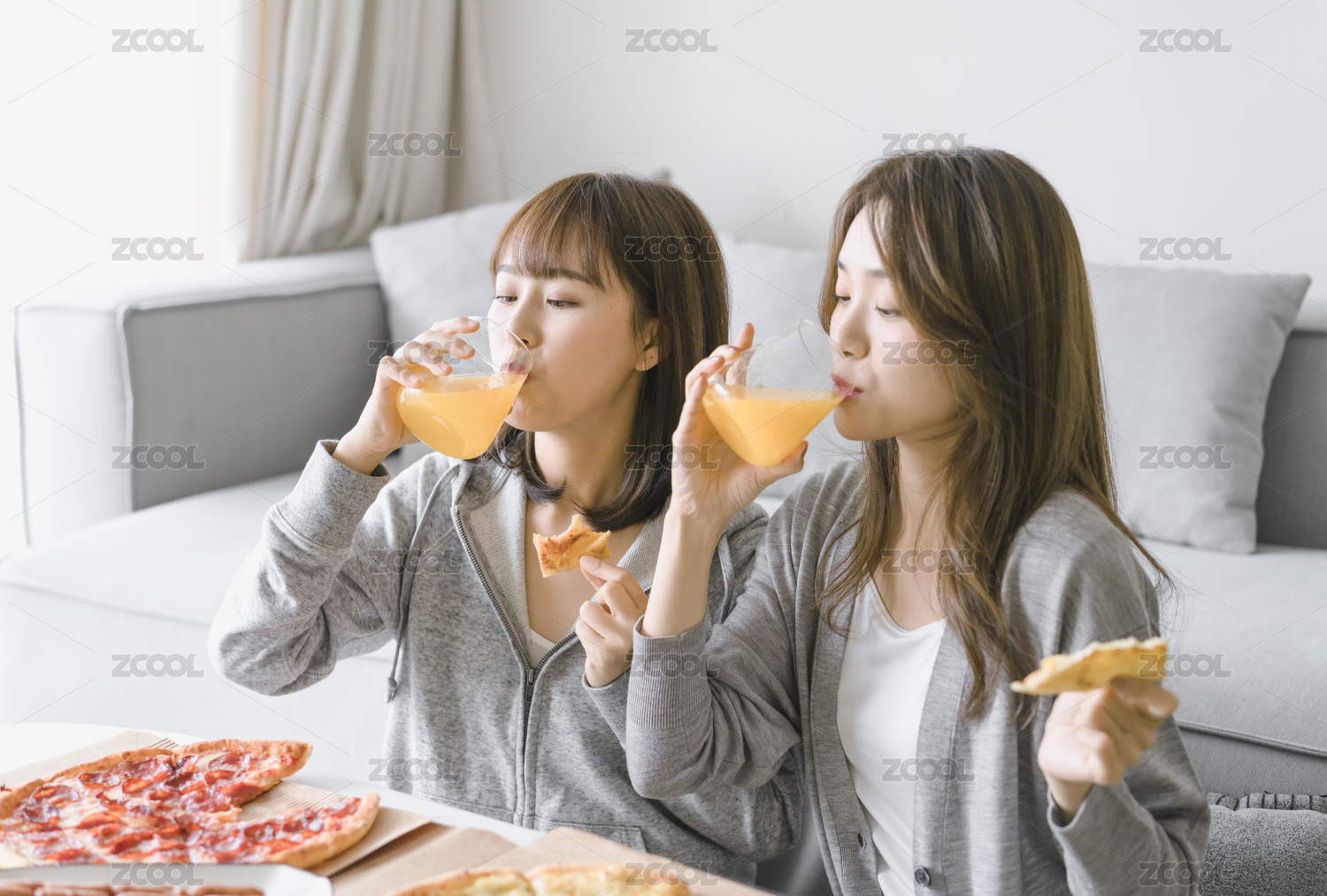 兩位女性閨蜜在客廳沙發(fā)前吃披薩