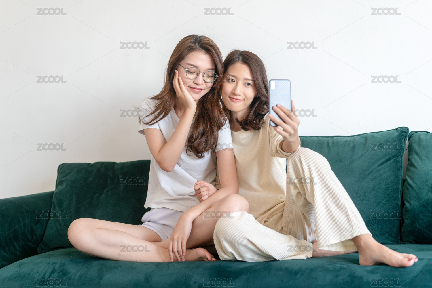 兩閨蜜在坐沙發(fā)休閑玩手機自拍