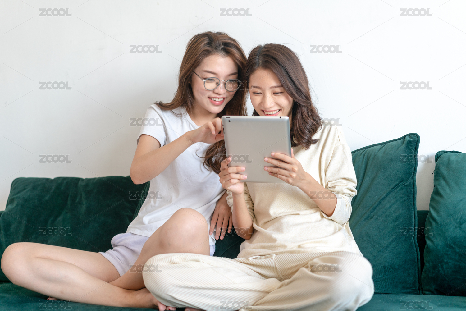 兩閨蜜在坐沙發(fā)休閑聊天玩平板電腦