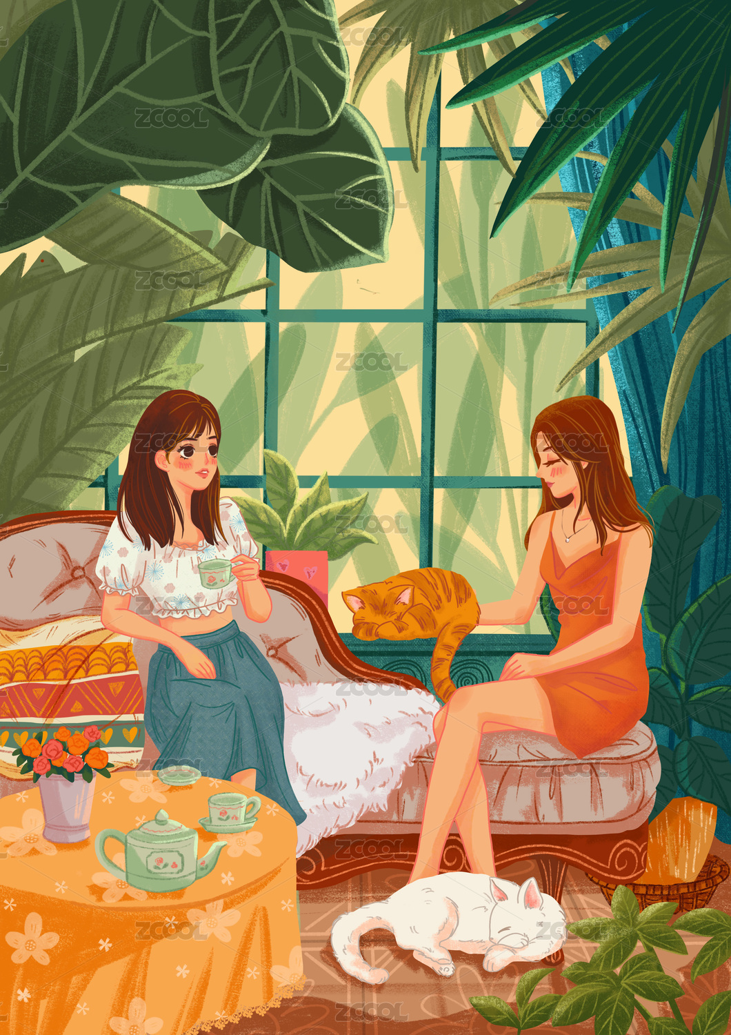 閨蜜一起坐在茶幾邊喝飲料