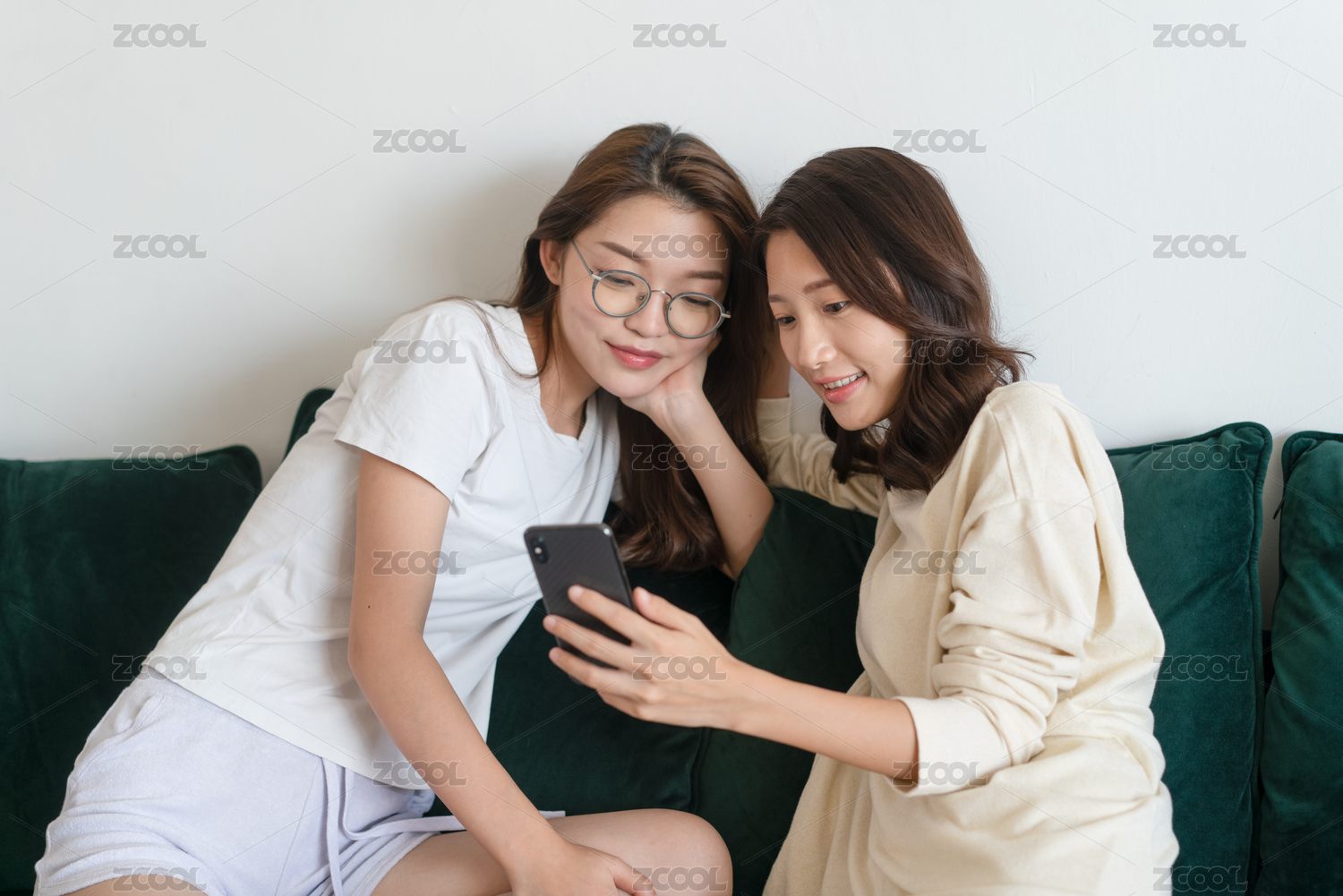 兩閨蜜在坐沙發(fā)休閑聊天玩手機