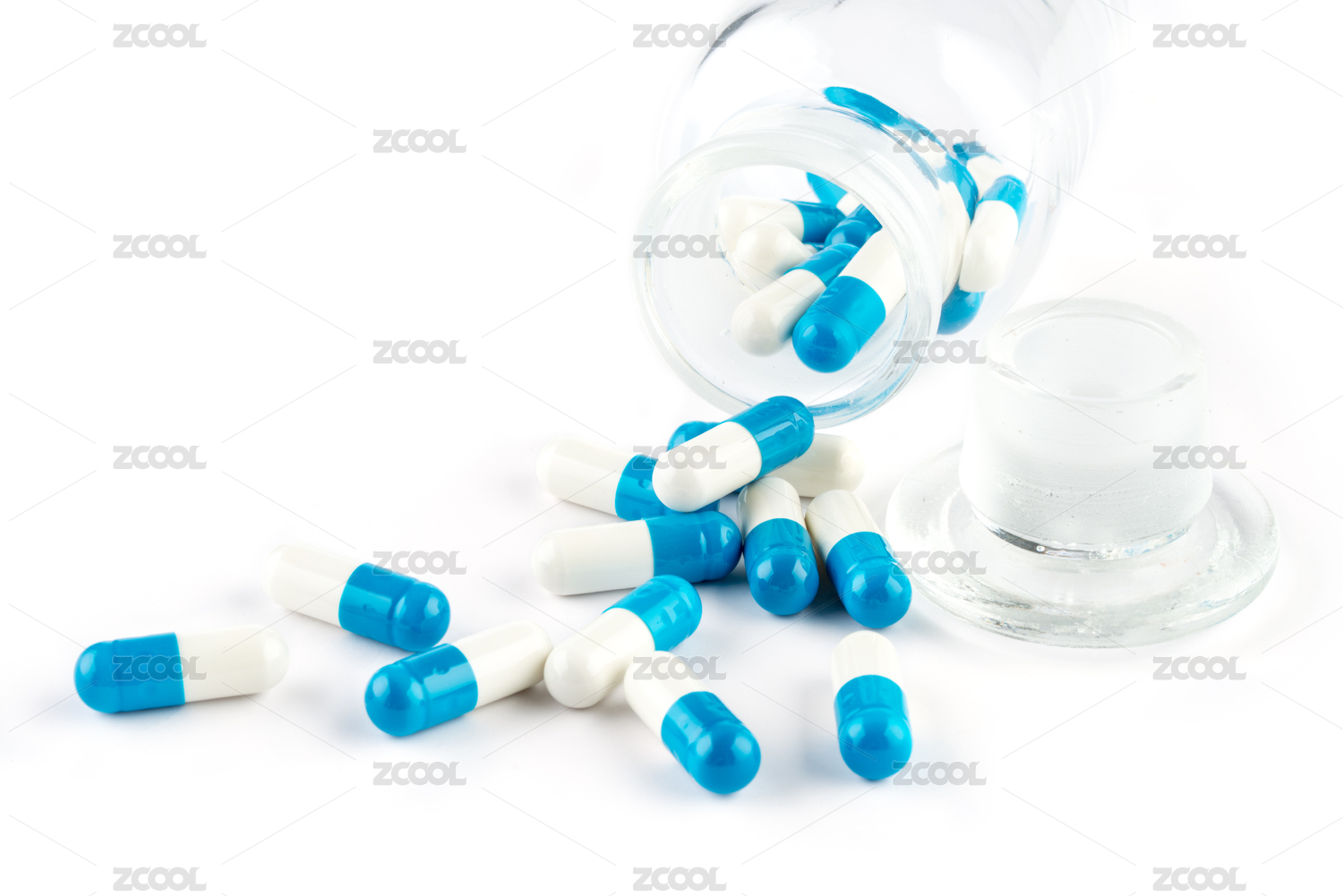藍(lán)色膠囊透明的瓶子,醫(yī)療保健和醫(yī)藥藥物治療