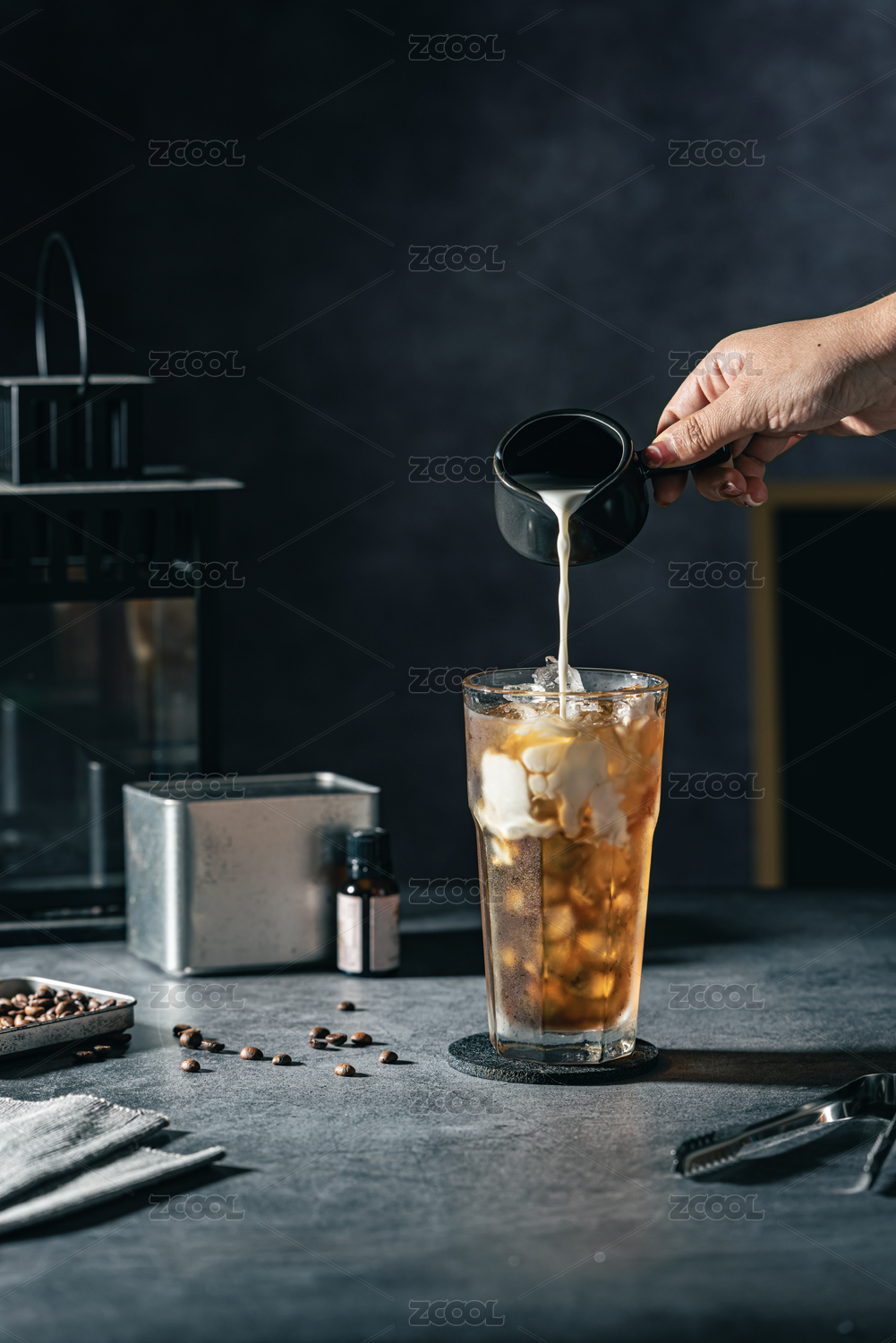 往放水泥臺面上裝滿冰咖啡的玻璃杯里倒牛奶