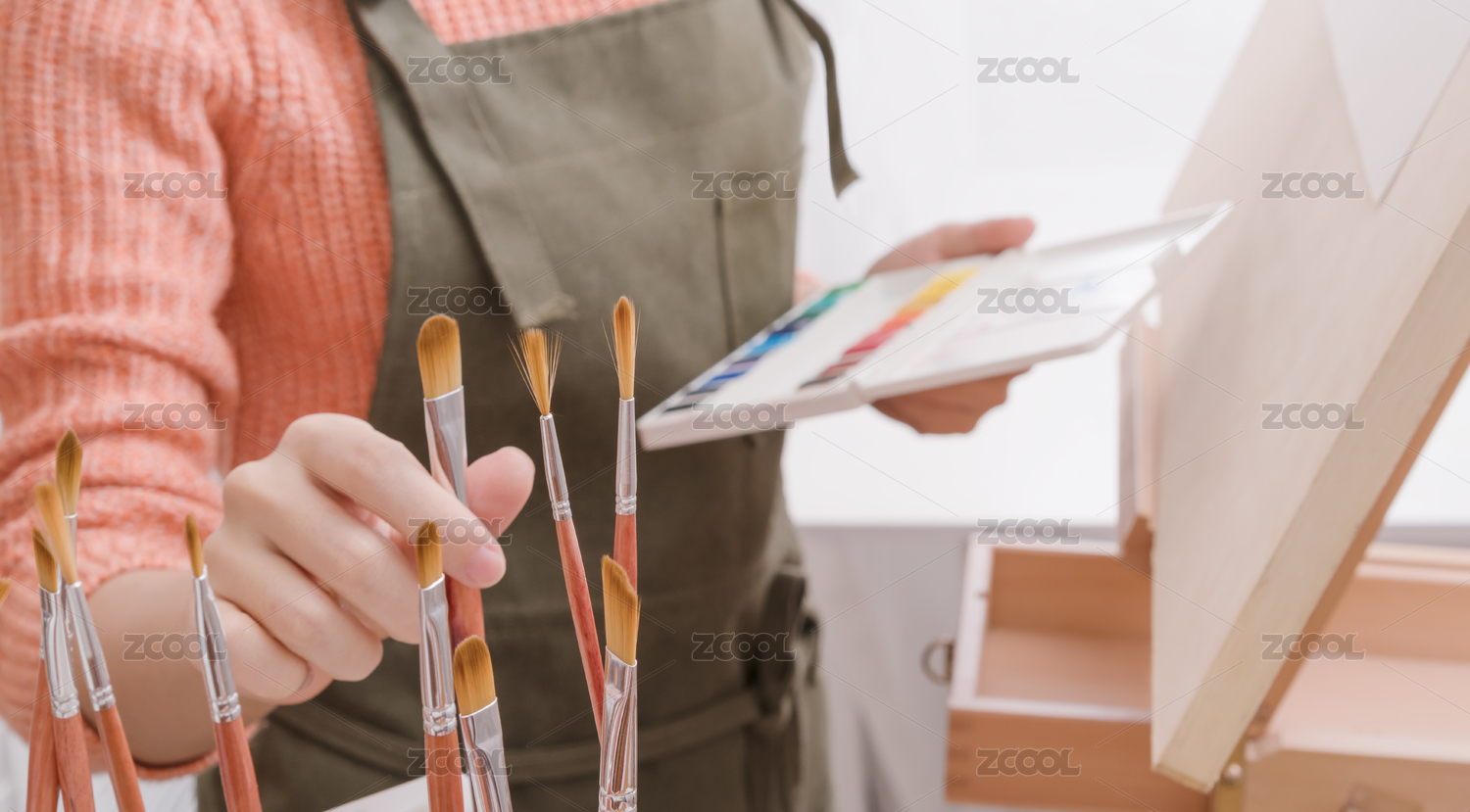 藝術(shù)工作者在畫室選擇畫筆準(zhǔn)備繪畫的特寫