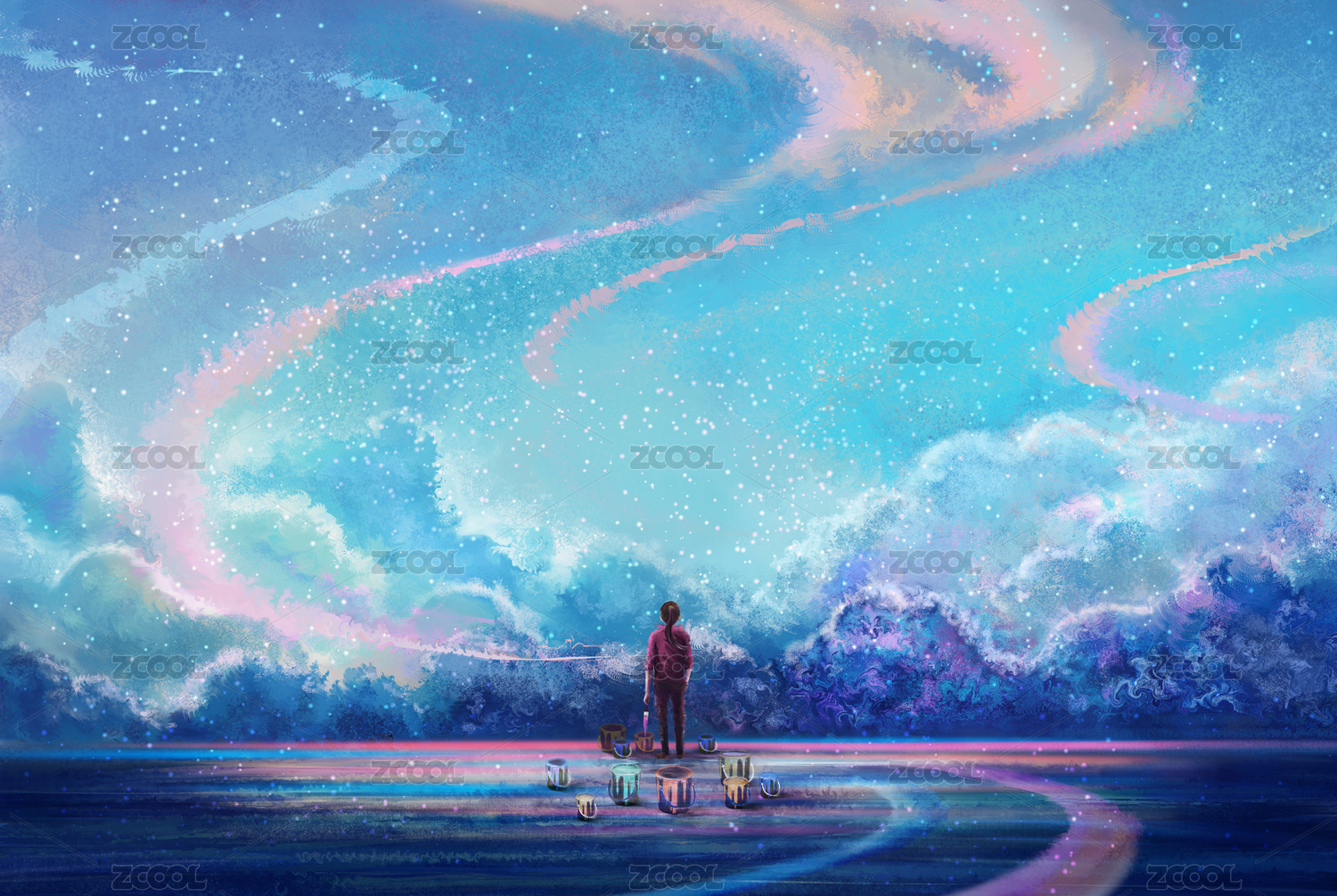 少女用畫筆繪畫出天空插畫
