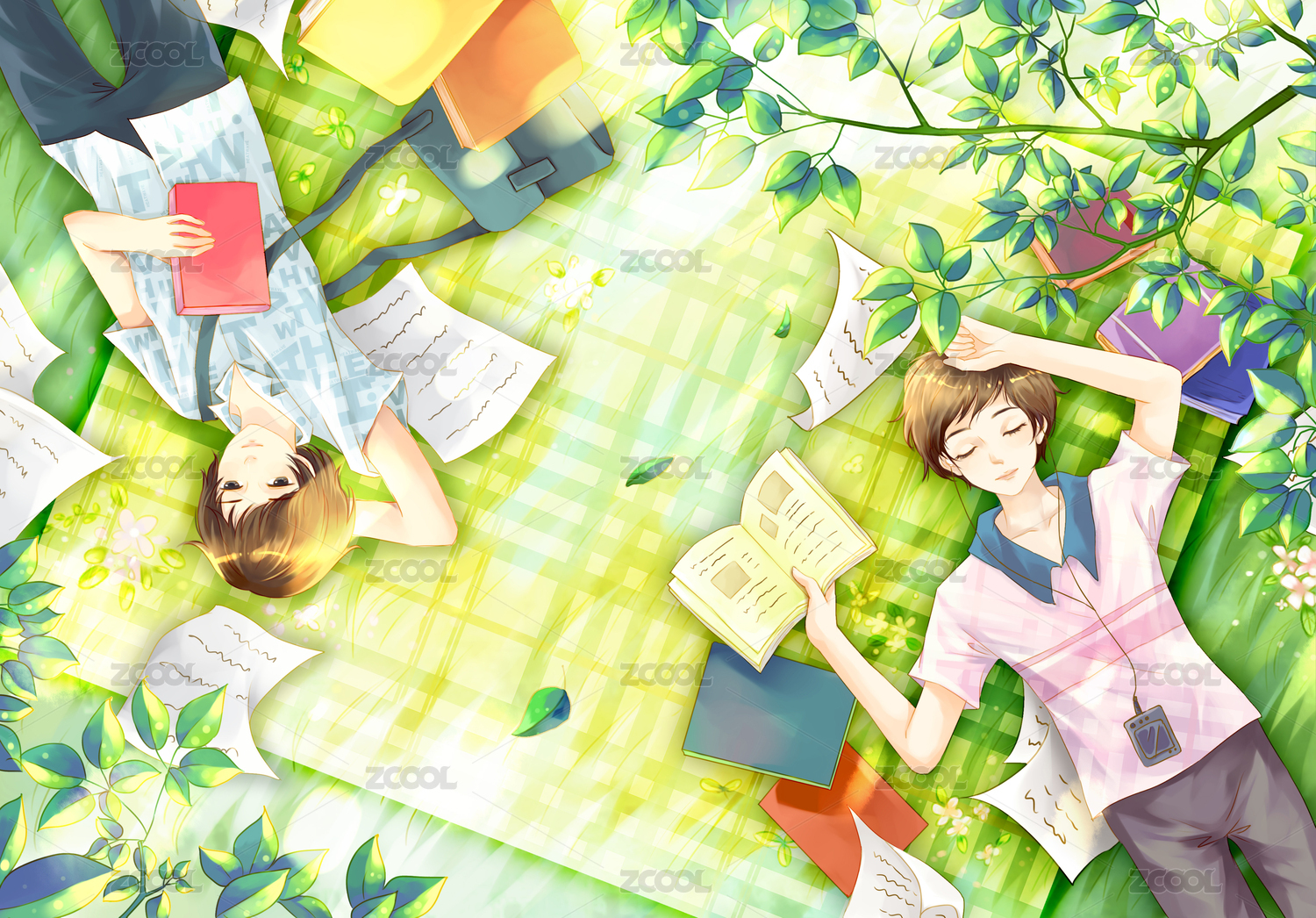 校園的樹蔭下復(fù)習(xí)累了在休息的少年