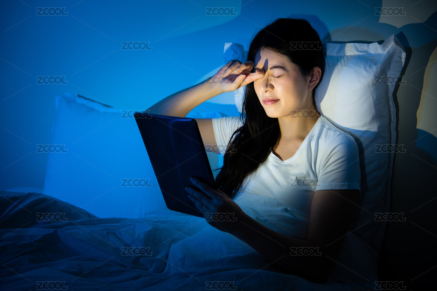 累美麗的女人使用數(shù)字平板電腦,晚上揉她的眼睛在床上?;煅獊喼薜闹袊J健?/div>