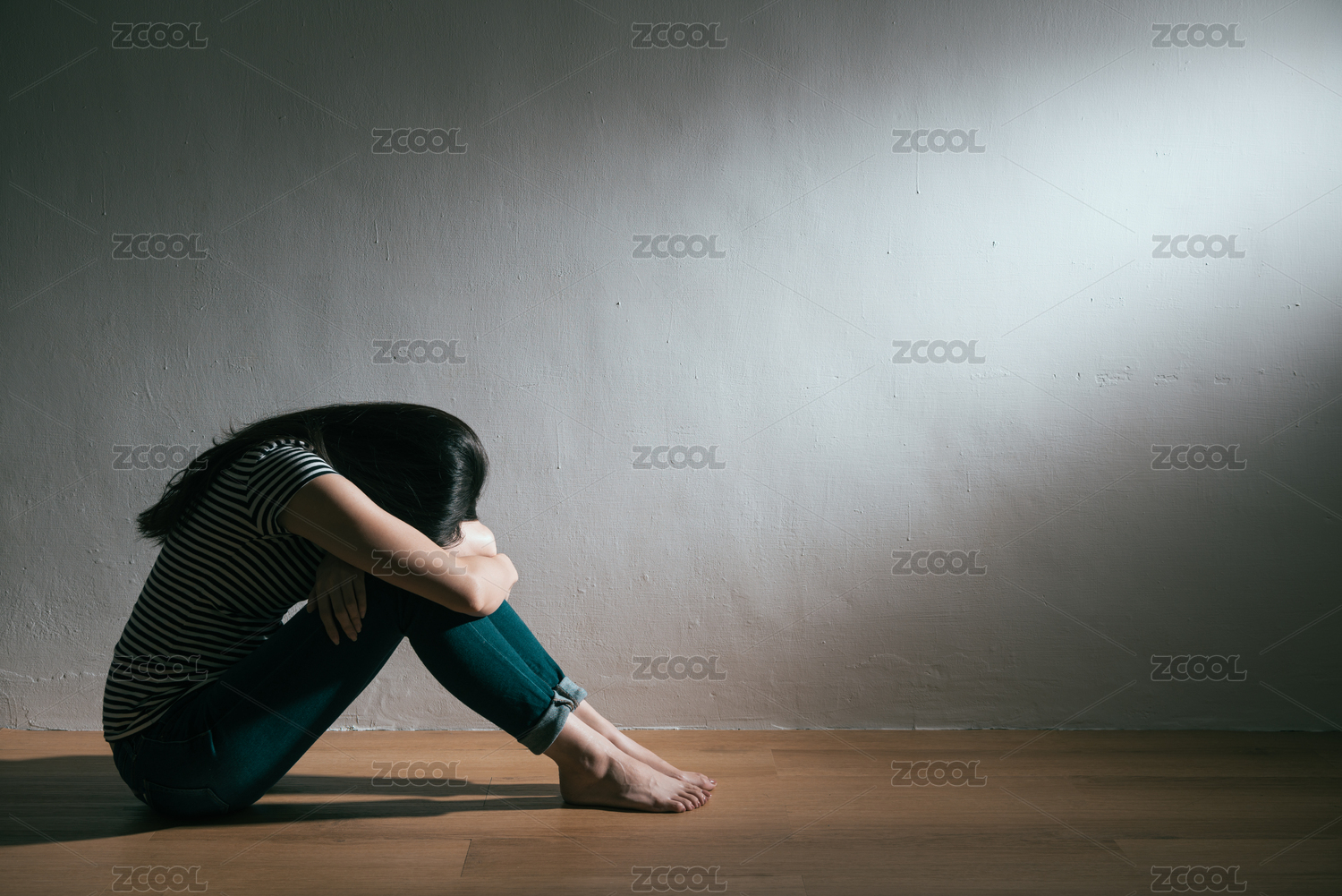 悲傷的年輕女子在休息白色背景,當(dāng)她失去了愛情和坐在木地板上哭的感覺,晚上累了。