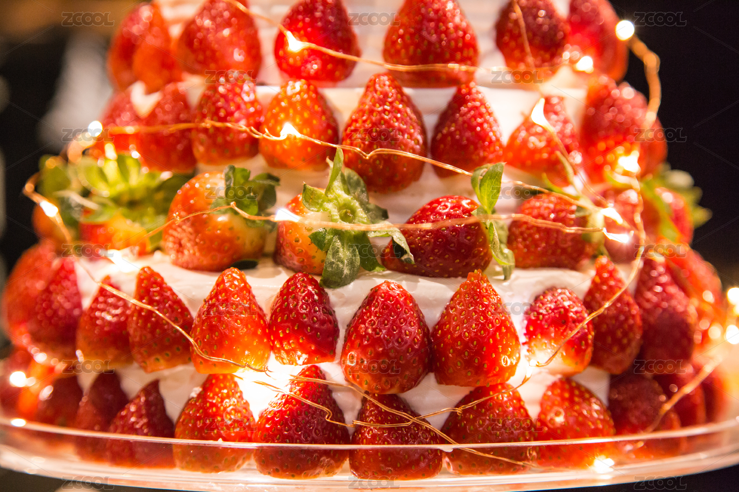 LED燈串裝飾的草莓奶油蛋糕特寫(xiě)