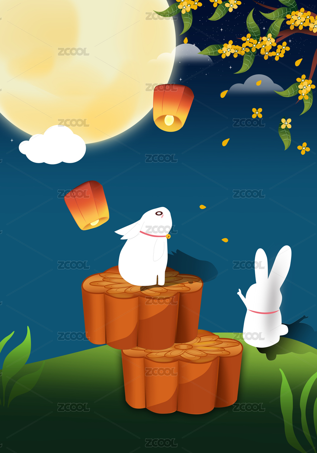 中秋節(jié)團(tuán)圓日桂花樹下玉兔賞月矢量插畫設(shè)計(jì)