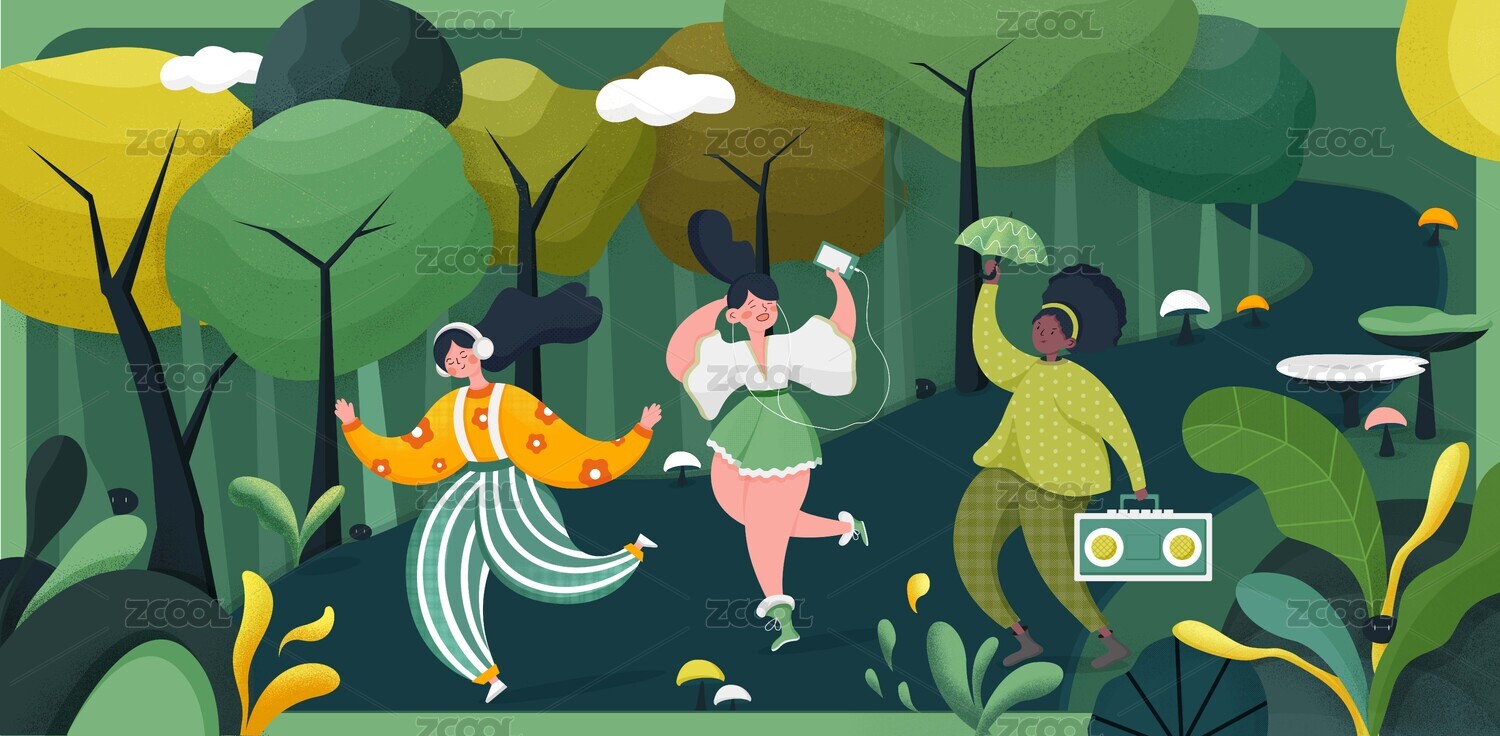 夏日森林快樂(lè)出游橫版插畫