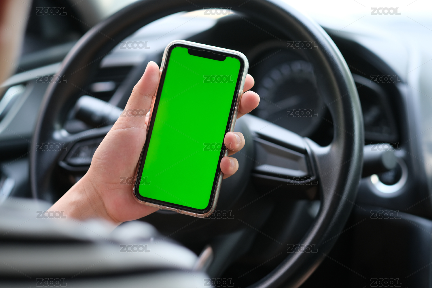 汽車?yán)锏鸟{駛員用手使用綠屏的手機