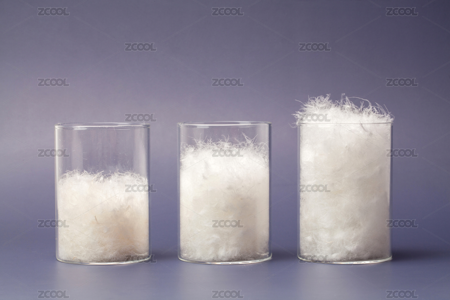 同克數(shù)不同蓬松度的羽絨在杯子里的對比