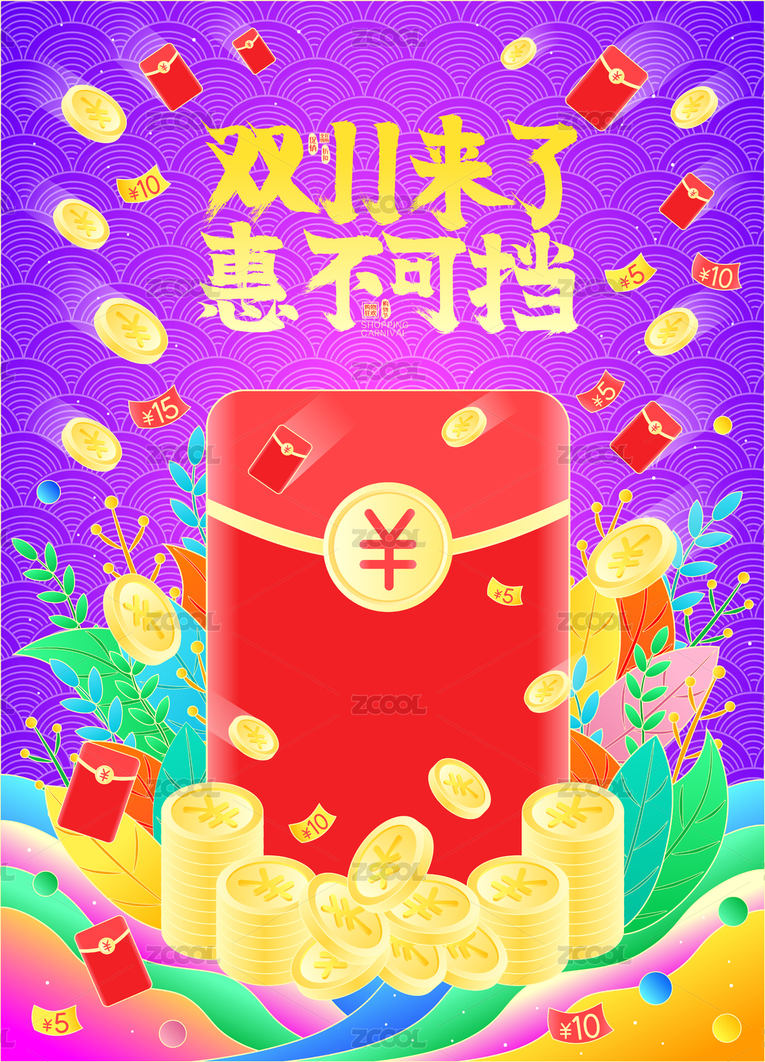 雙十一來了惠不可擋紅包雨來襲矢量插畫海報