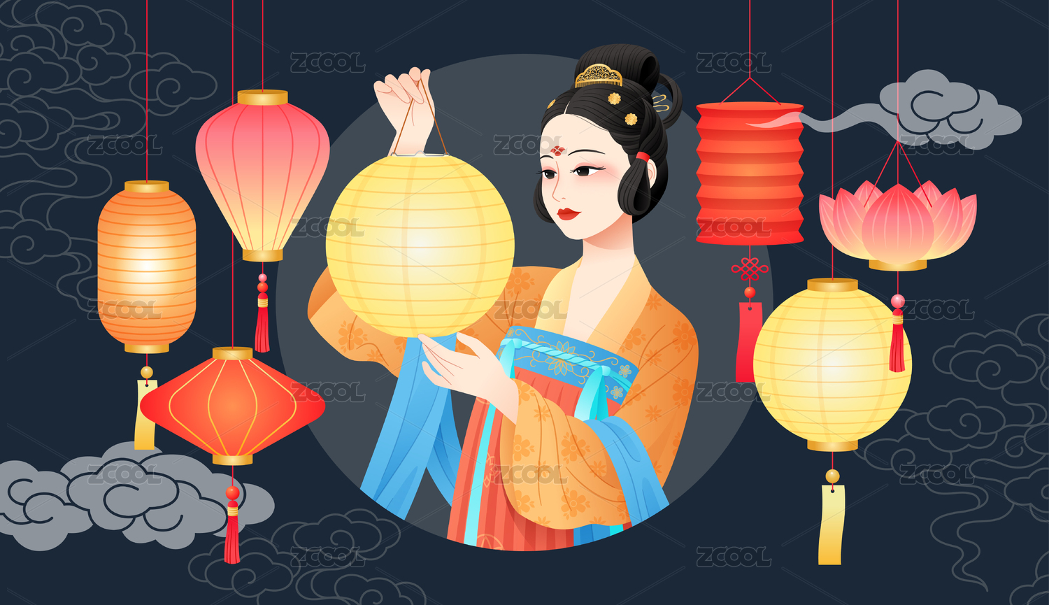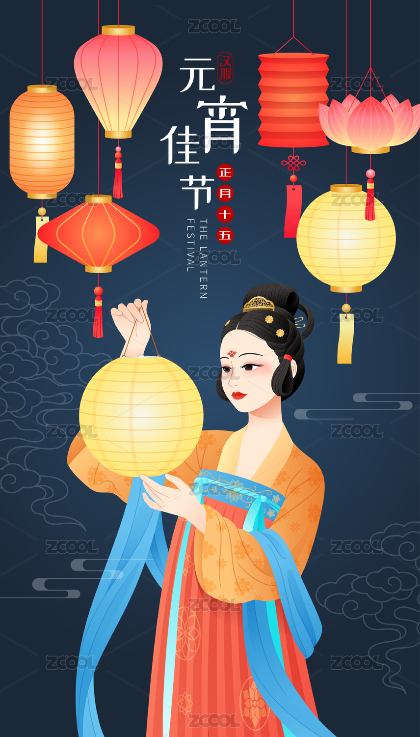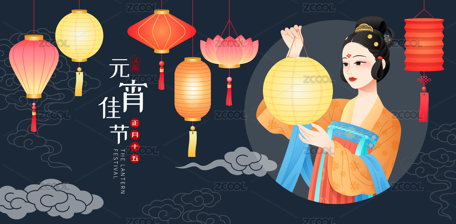 元宵節(jié)一位漢服少女和花燈插畫(huà)