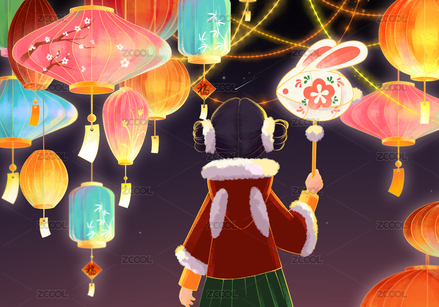 一個(gè)提著燈籠的漢服少女和花燈插畫(huà)