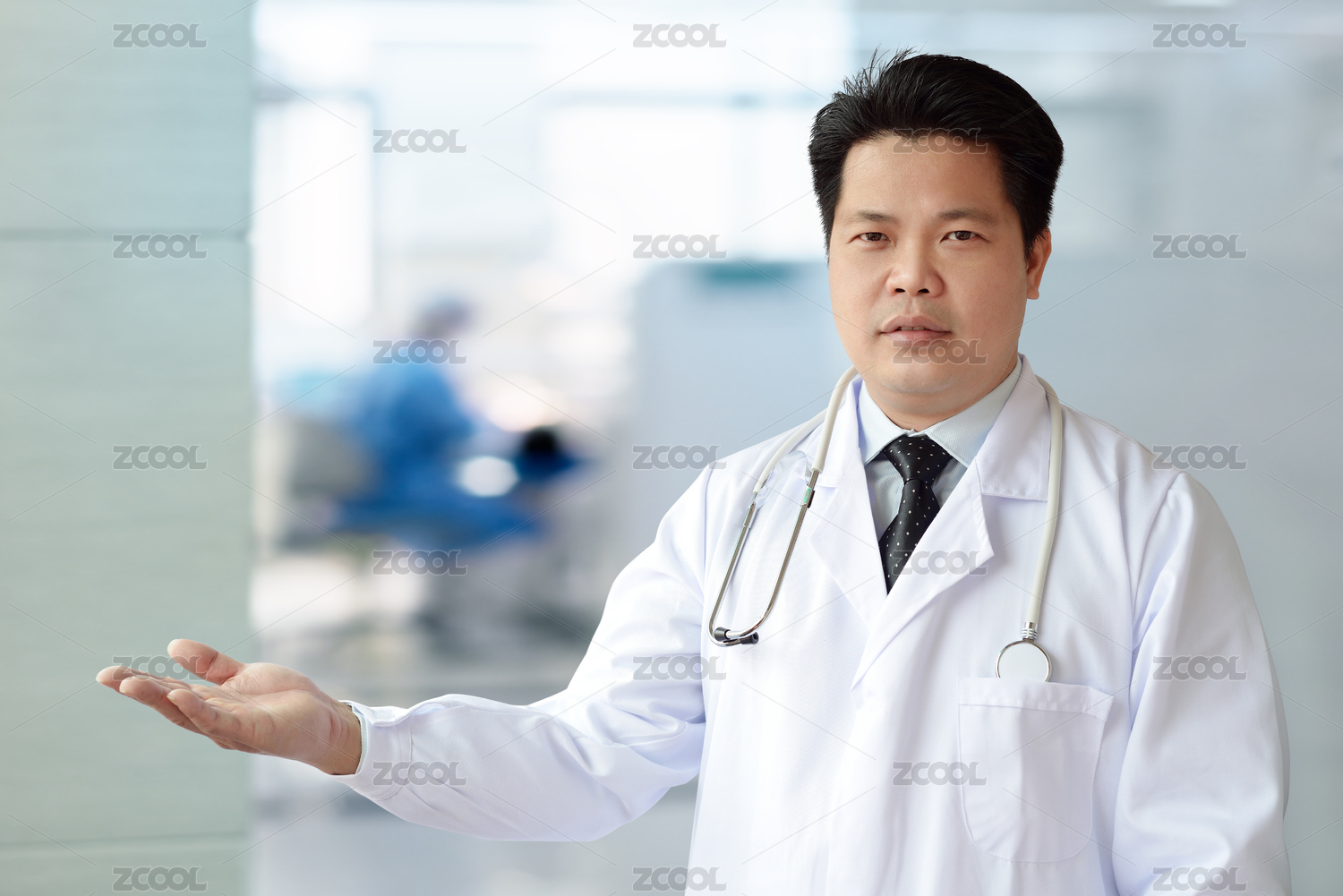一中年男醫(yī)生右手做介紹手勢的半身肖像