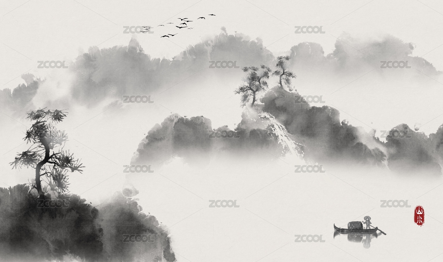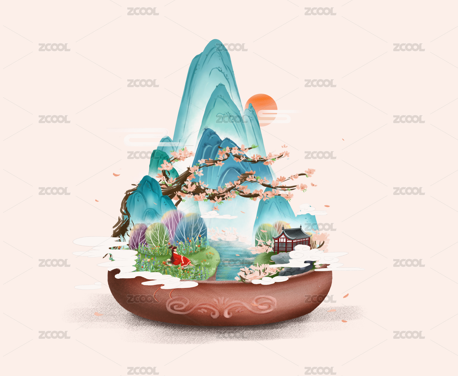 中國古風水墨微觀山水場景草木叢生繁花盛開