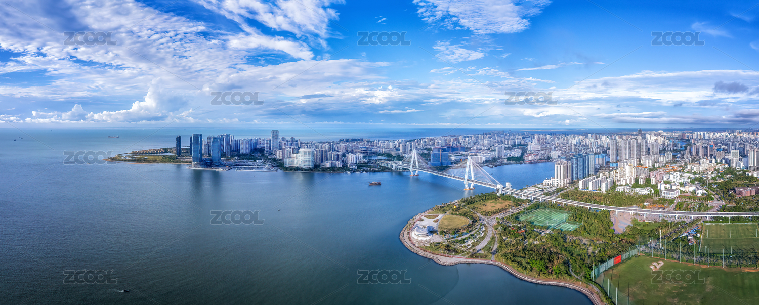 航拍海南??谑兰o大橋城市景觀天際線